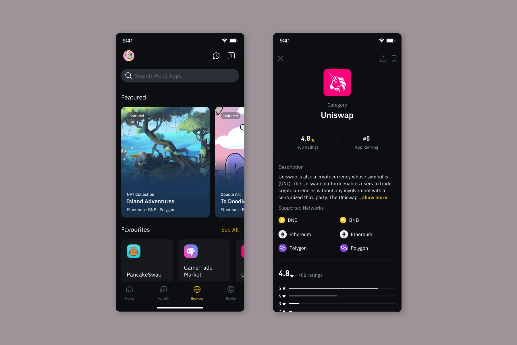 Binance is one of the largest crypto exchanges in the world. I worked with Binance.US to design a Web3 Wallet that would give their users the ability to safely interact with other web3 applications without leaving the