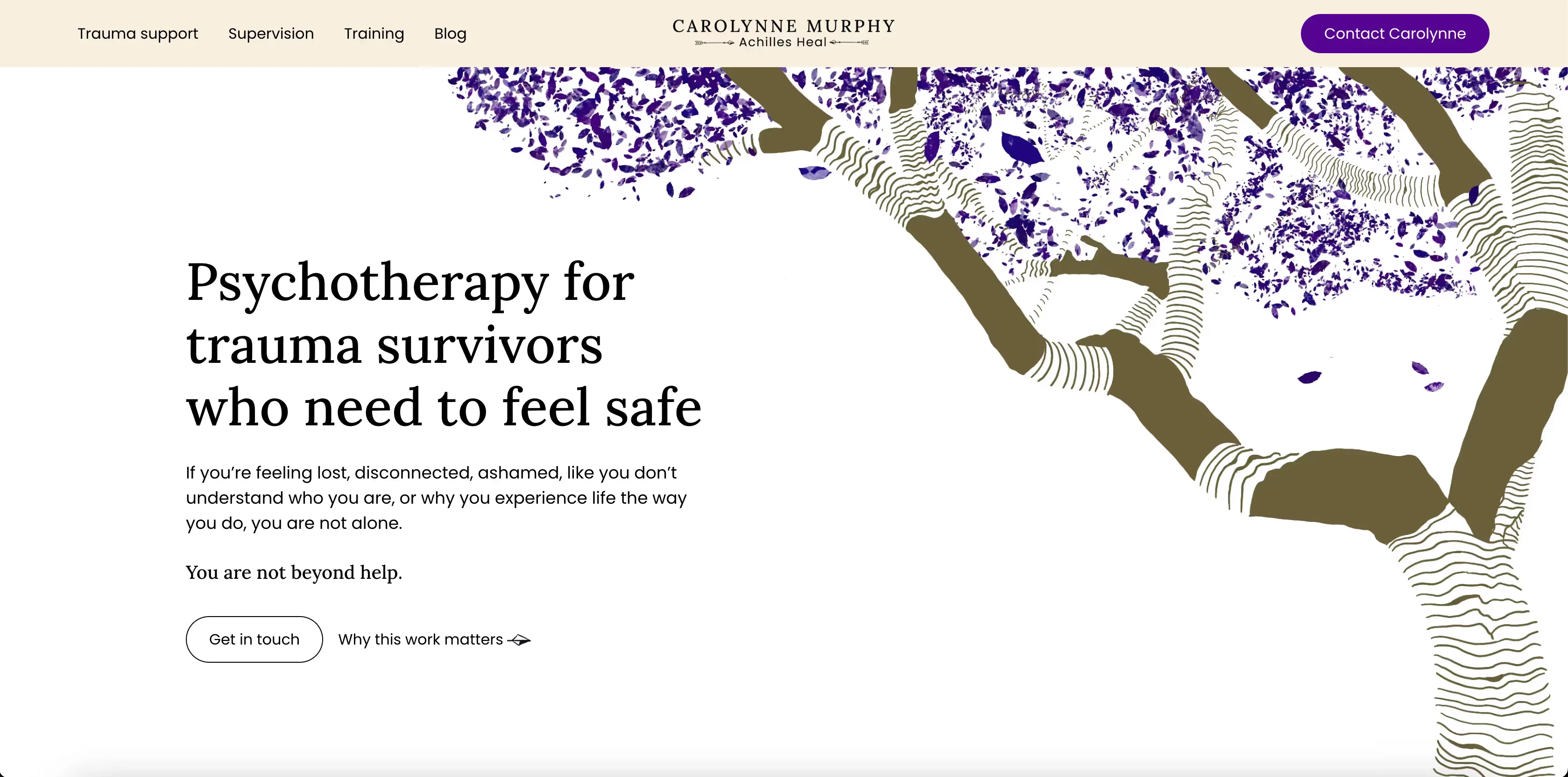 Carolynee had a clear request when it came to colour: she wanted to use indigo, a colour that represents intuition, perception, and the higher mind. The biggest feeling she wanted the website to communicate was safety. However, when I tried using indigo as a background or in large sections, it felt too bright and overwhelming for the tone of the site. Instead, I wove it into the illustrations—shading the leaves in different tones of indigo—and used it strategically to highlight key elements like buttons.