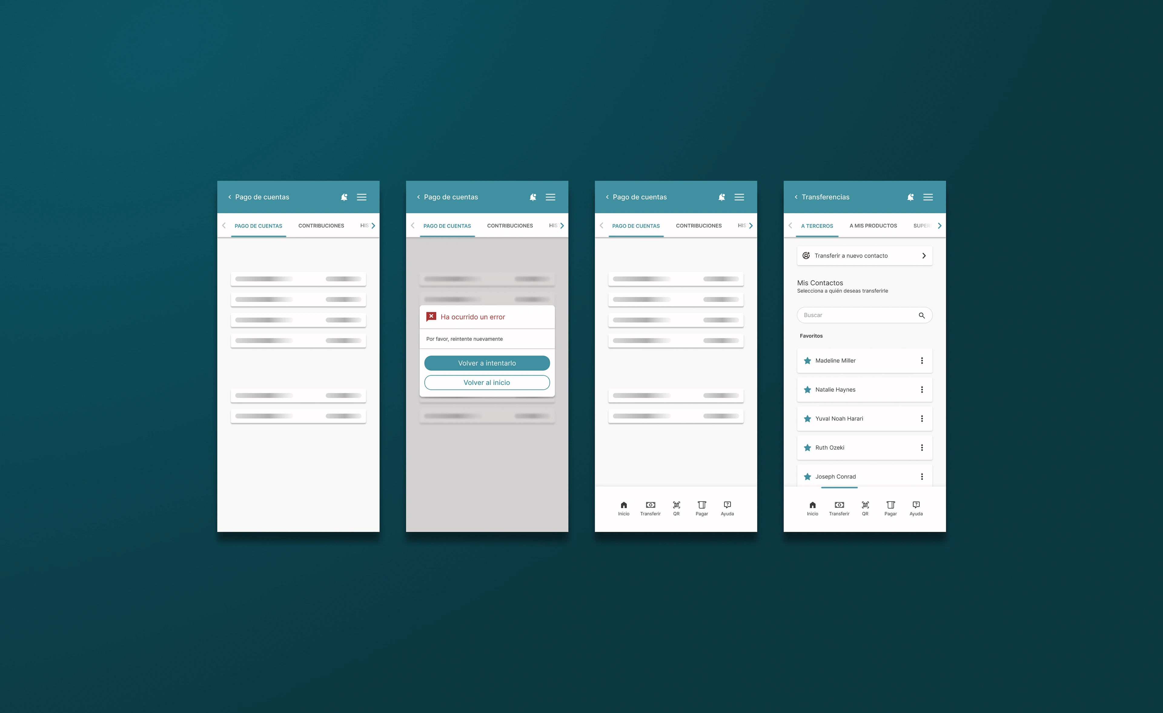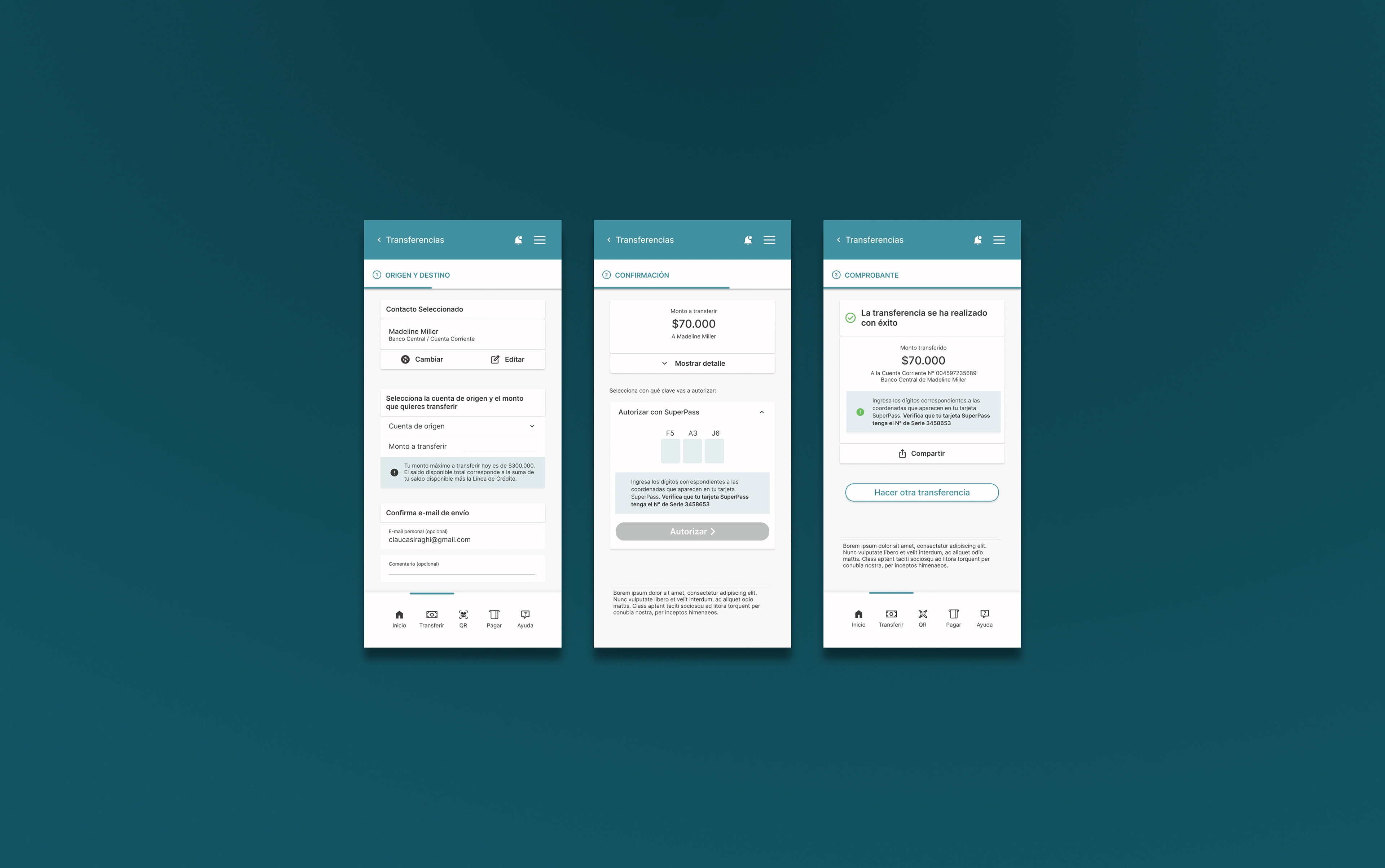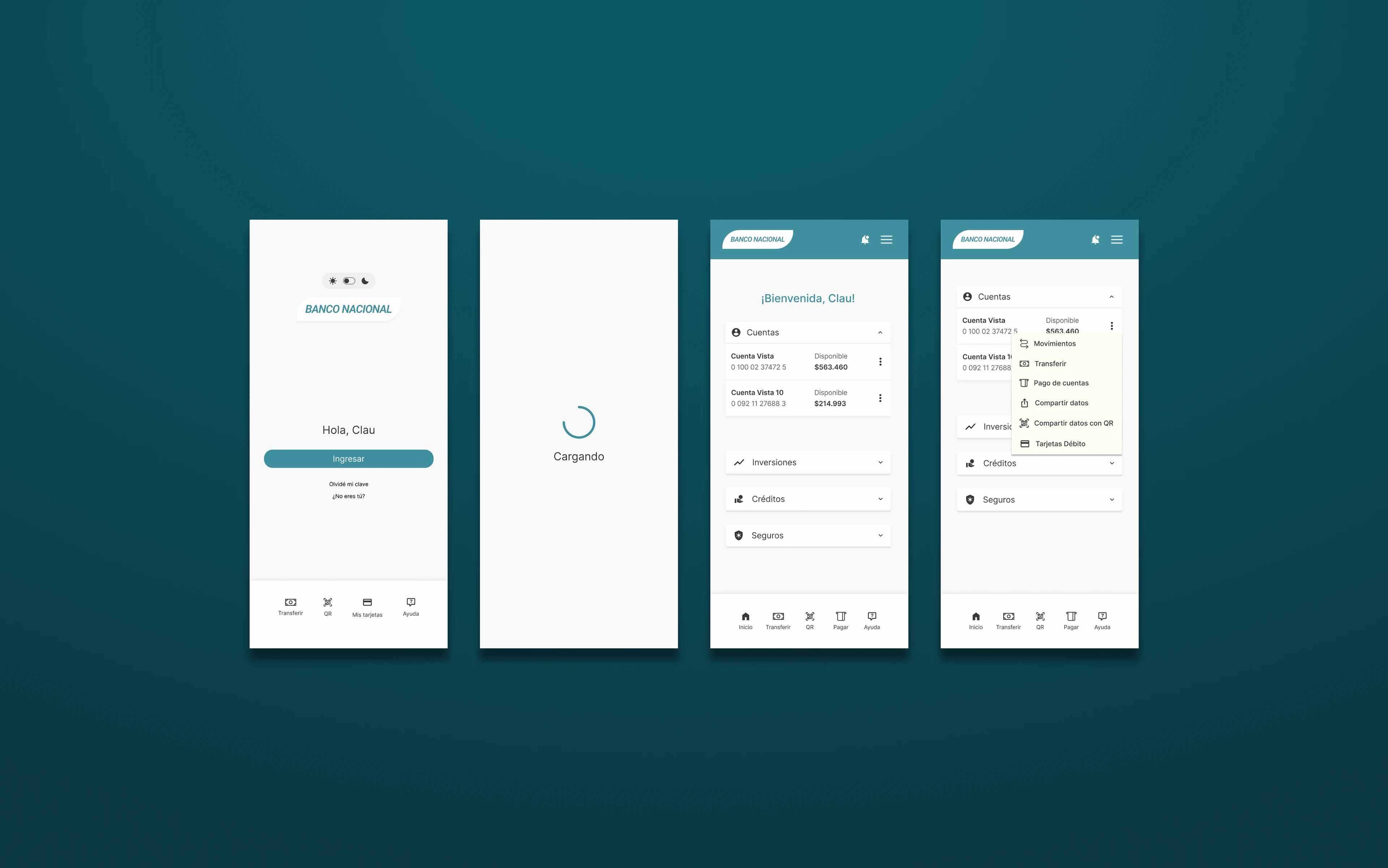 Clean and elegant baking user interface. Mock-up depicts user login flow + bank transaction for Banco Nacional