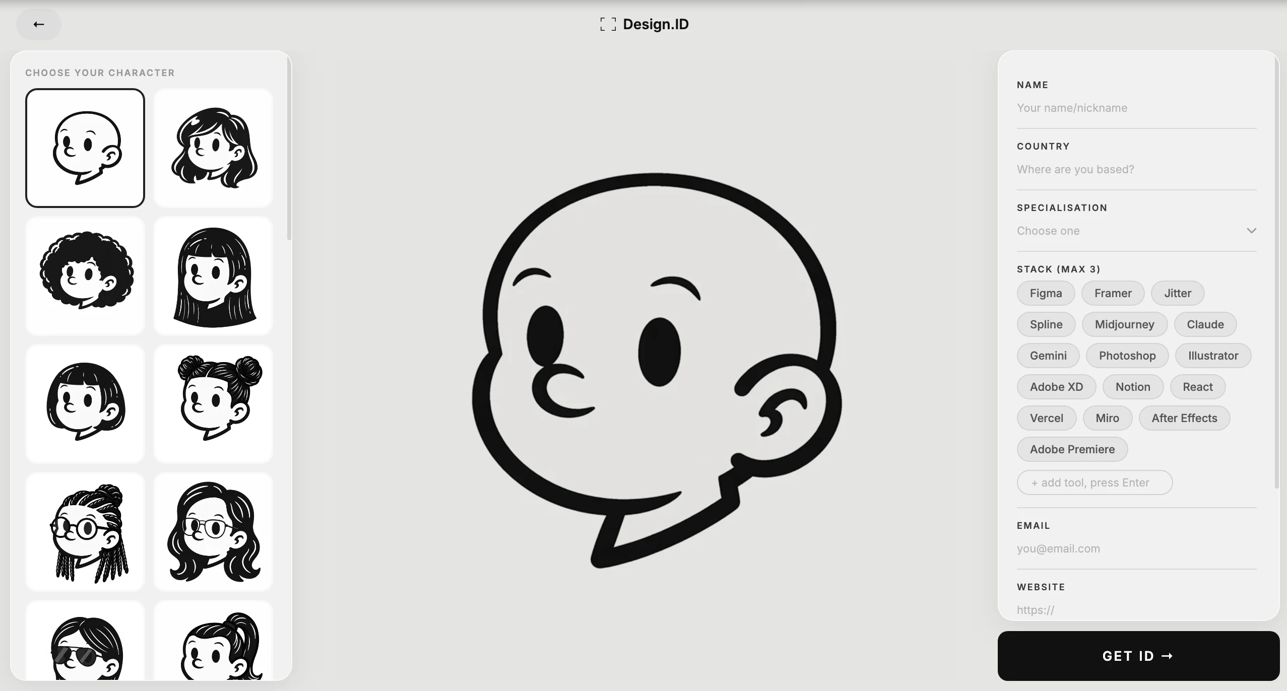 Design.ID is an interactive web experience that lets designers build a personalised ID card: choose a character, fill in your details, sign your name, and walk away with something that actually feels like yours.