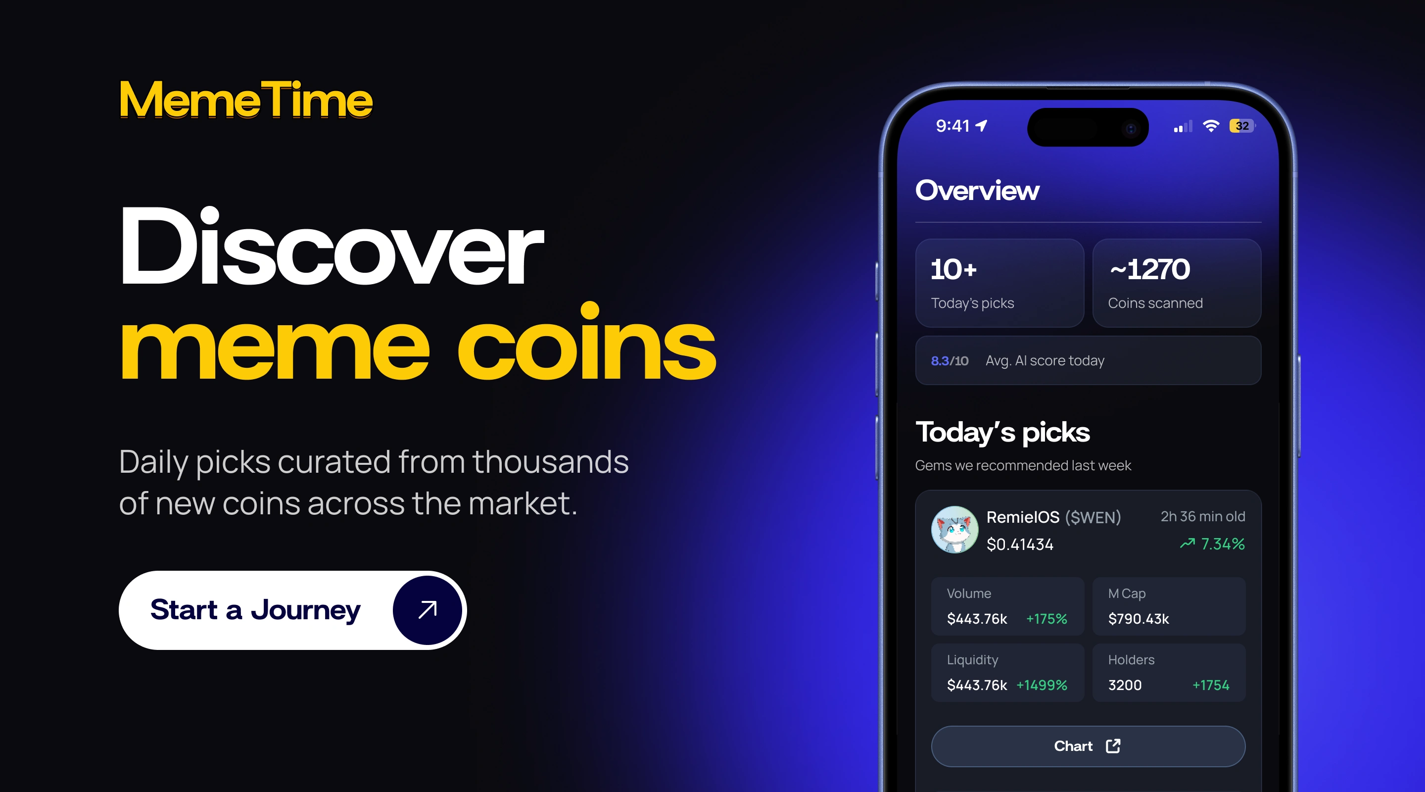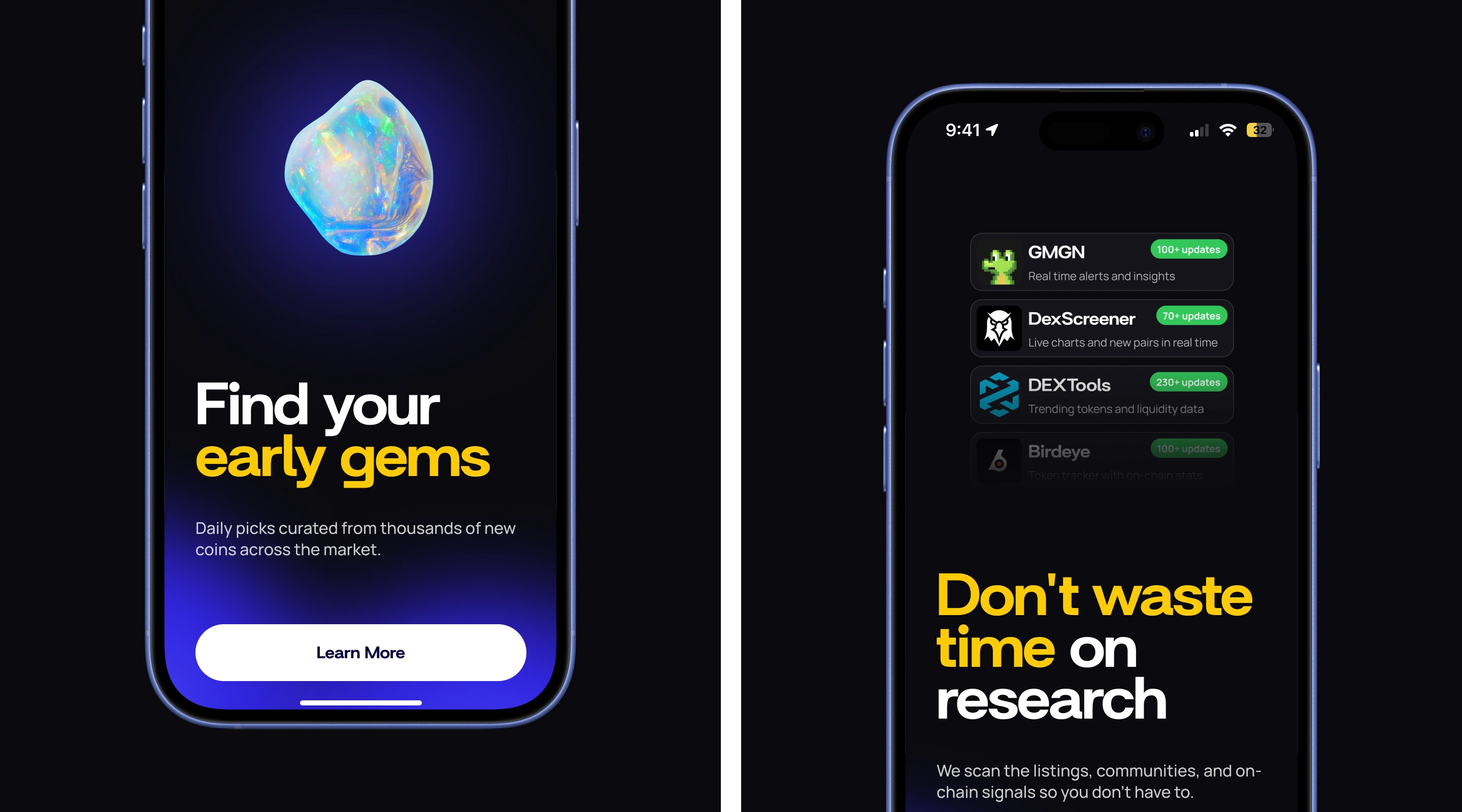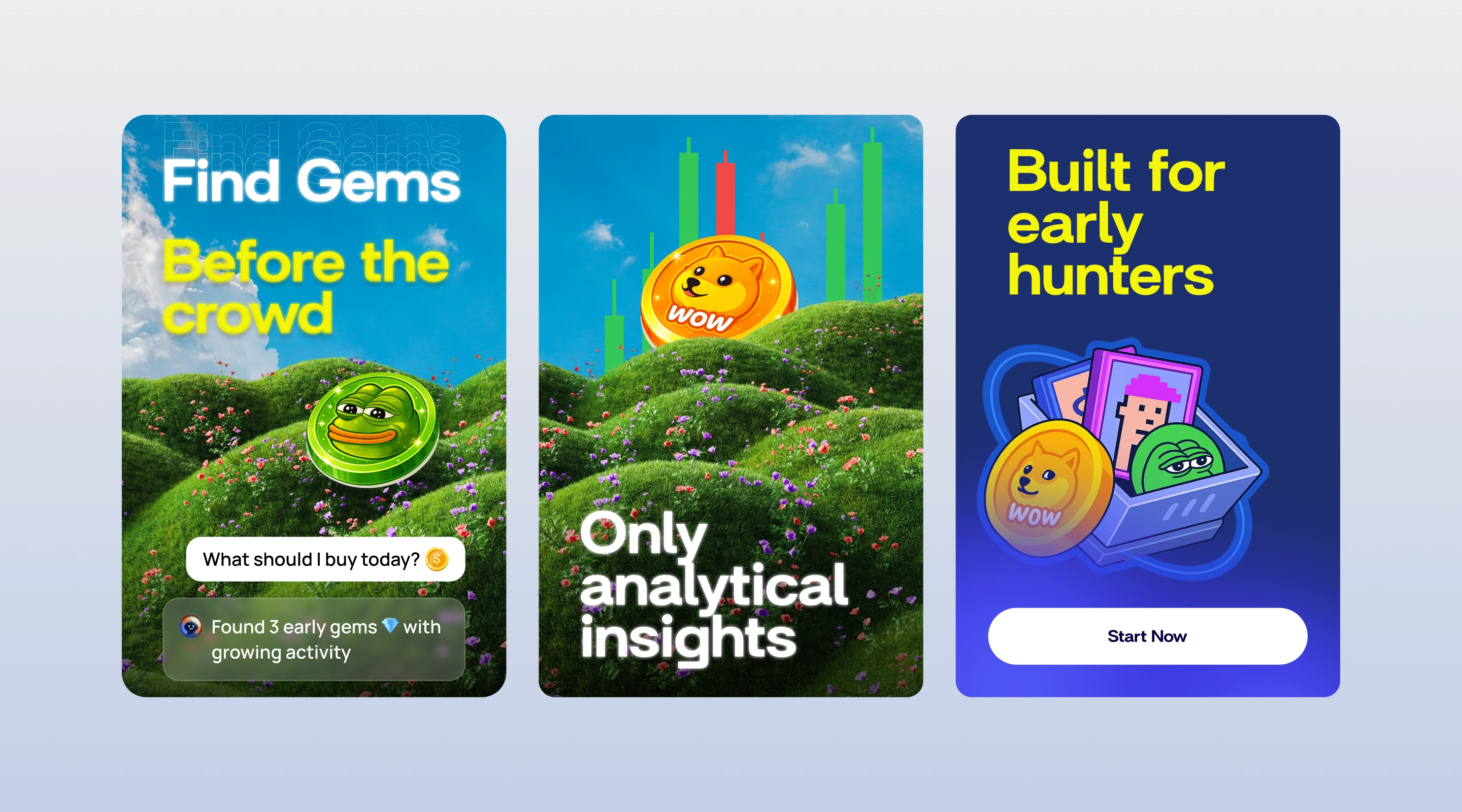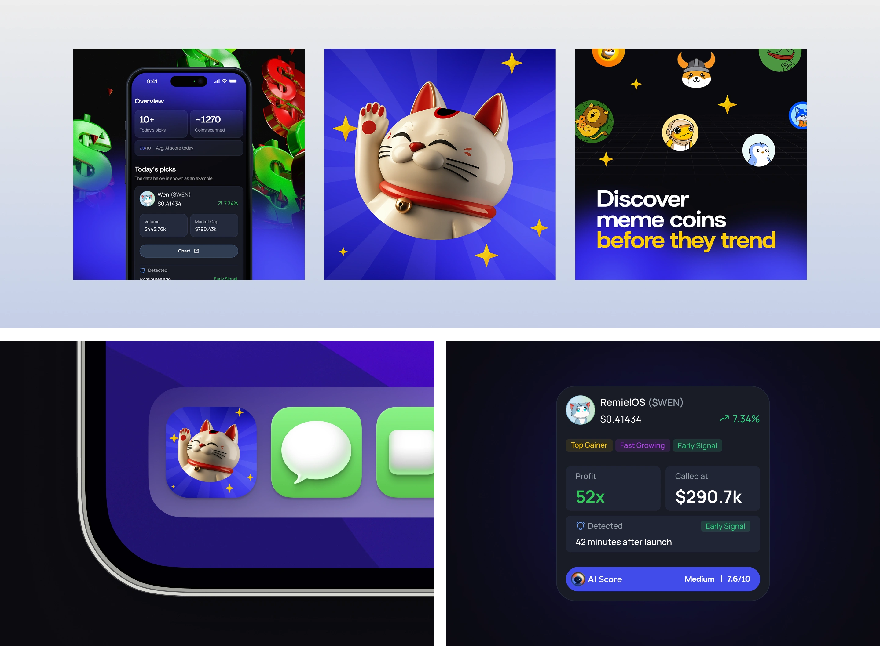 We developed a bold, high-energy visual system that reflects the fast-moving nature of meme coin discovery. The interface is built around deep dark tones and vibrant gradients, creating a sense of focus, intensity, and opportunity—while allowing key insights and signals to stand out instantly.