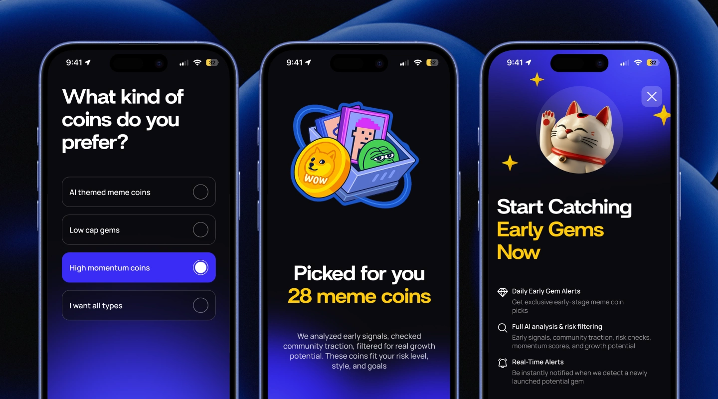 Bright accent colors are used to highlight important actions and data points, such as selected preferences, trending coins, and early alerts, guiding users toward quick decisions without adding noise to the experience.