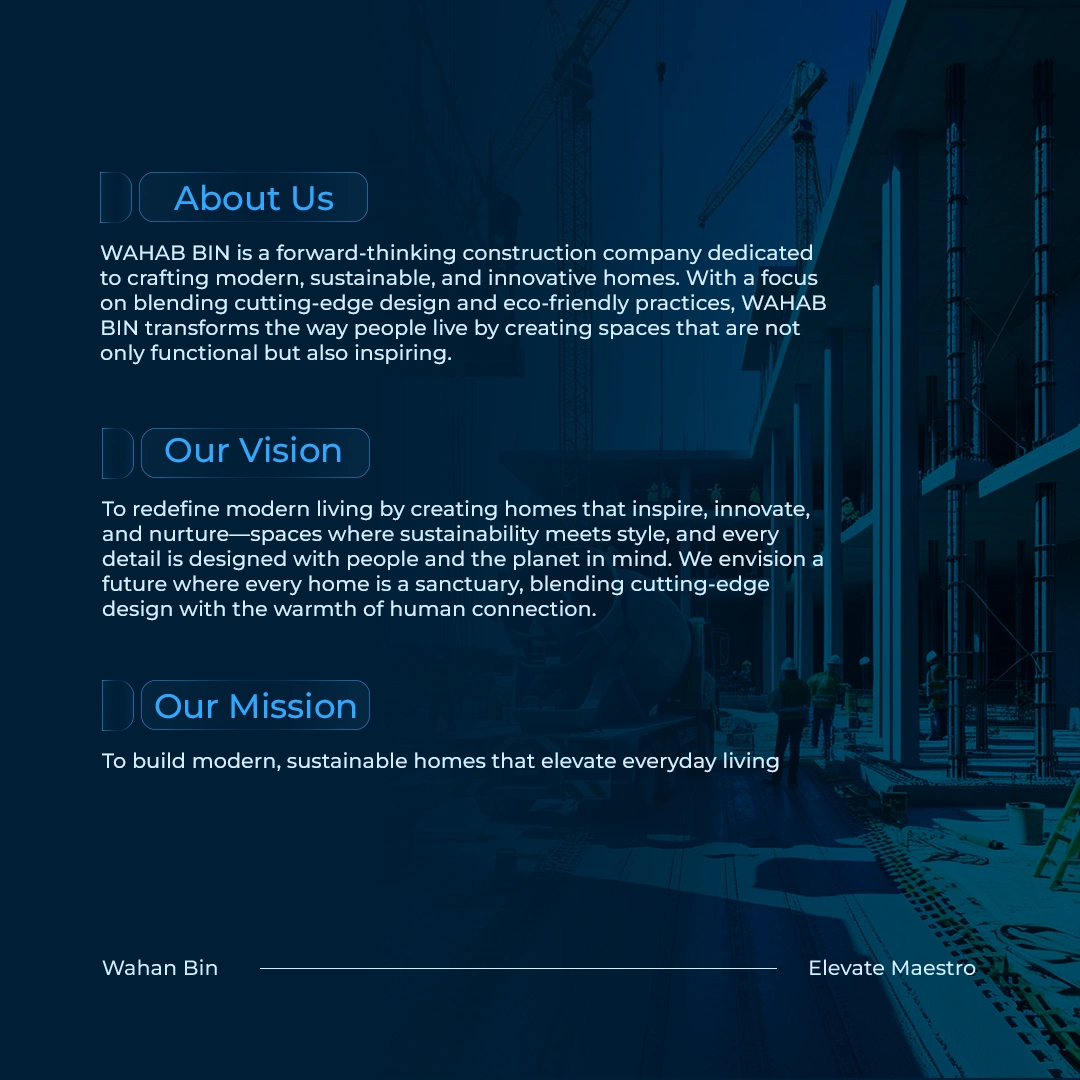 To redefine modern living by creating homes that inspire, innovate, and nurture—spaces where sustainability meets style, and every detail is designed with people and the planet in mind. We envision a future where every home is a sanctuary, blending cutting-edge design with the warmth of human connection.