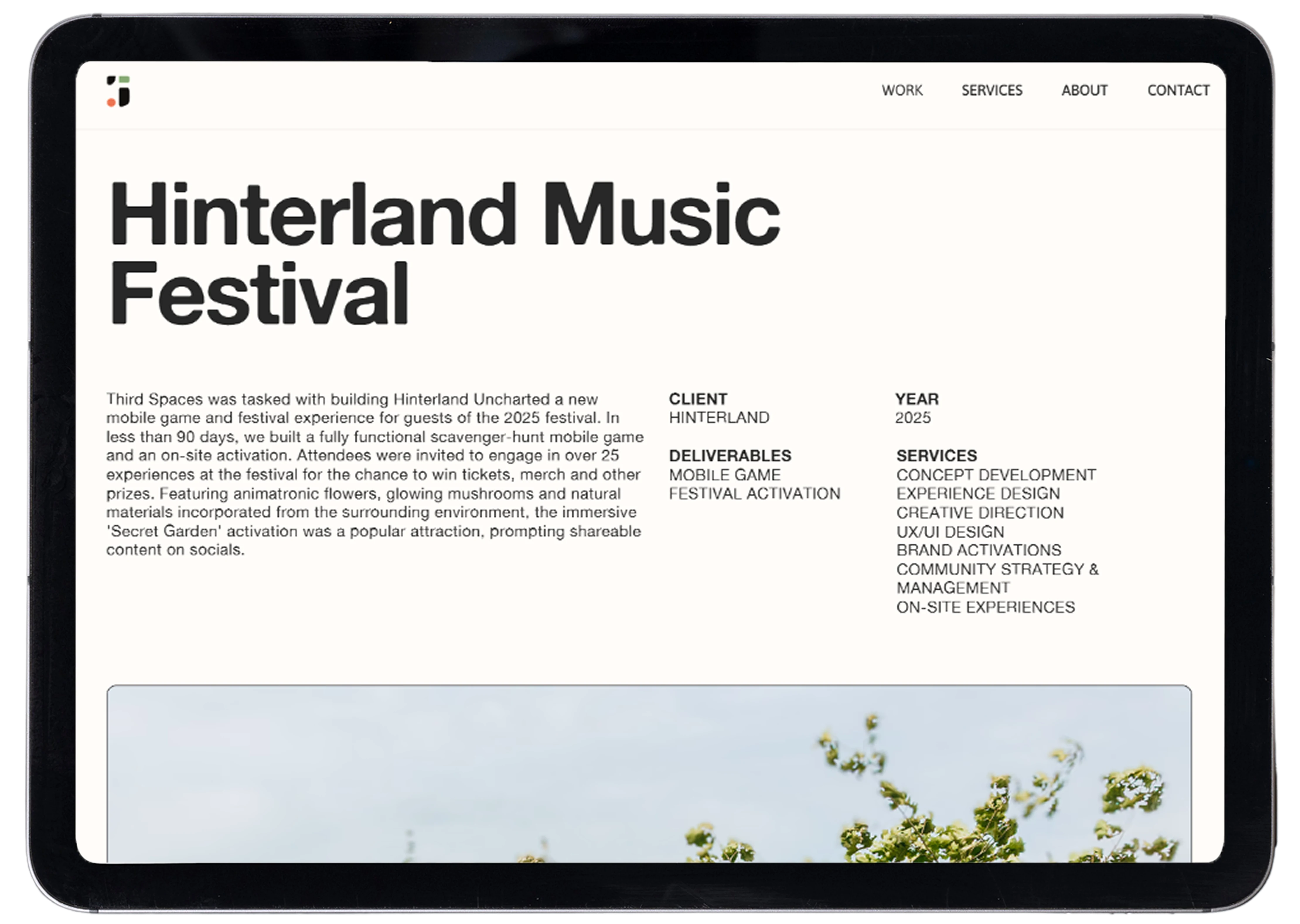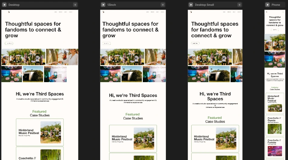 I designed the branding & website for Third Spaces' new creative studio using Figma and Framer. I optimized a responsive design across desktop, ipad and mobile
