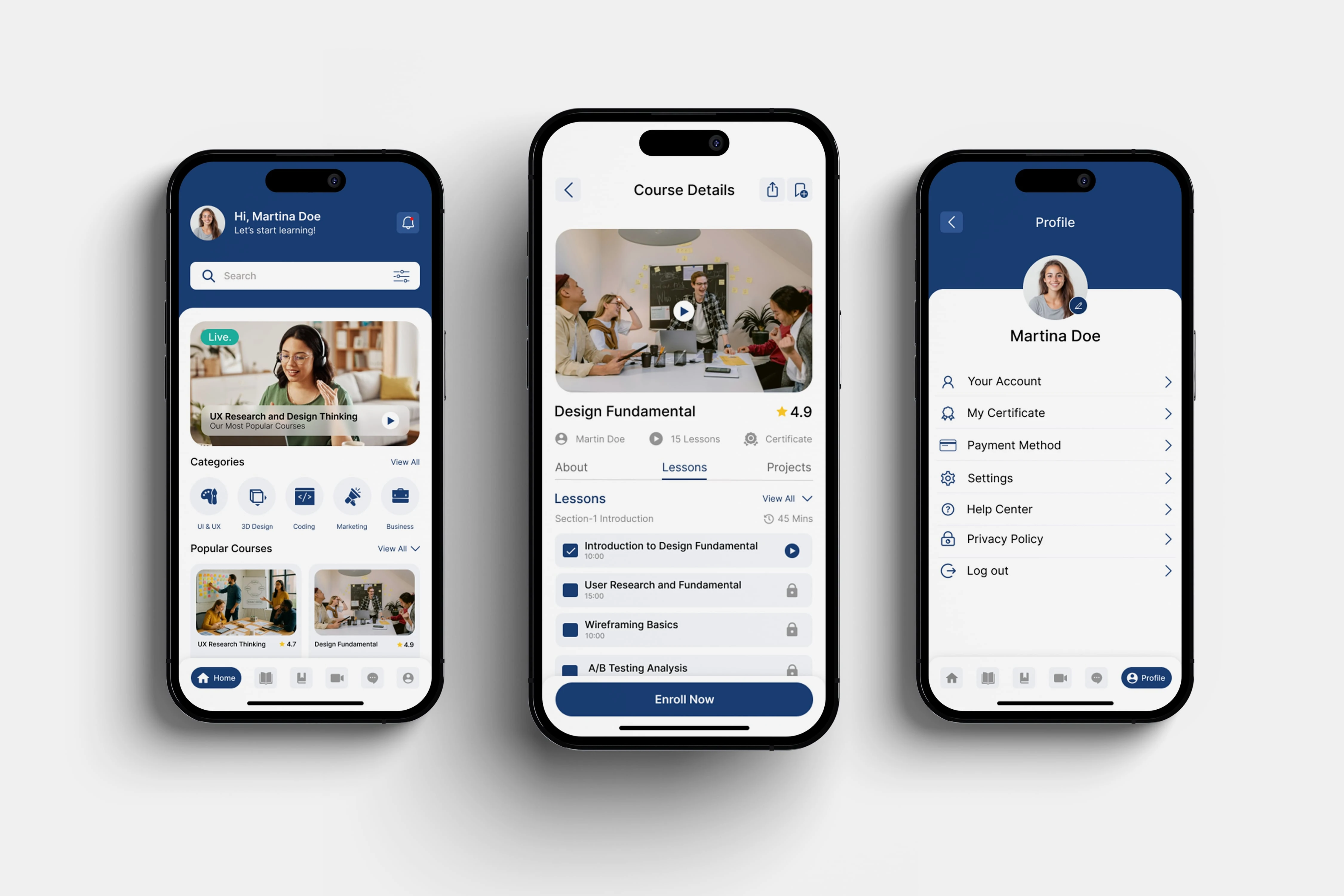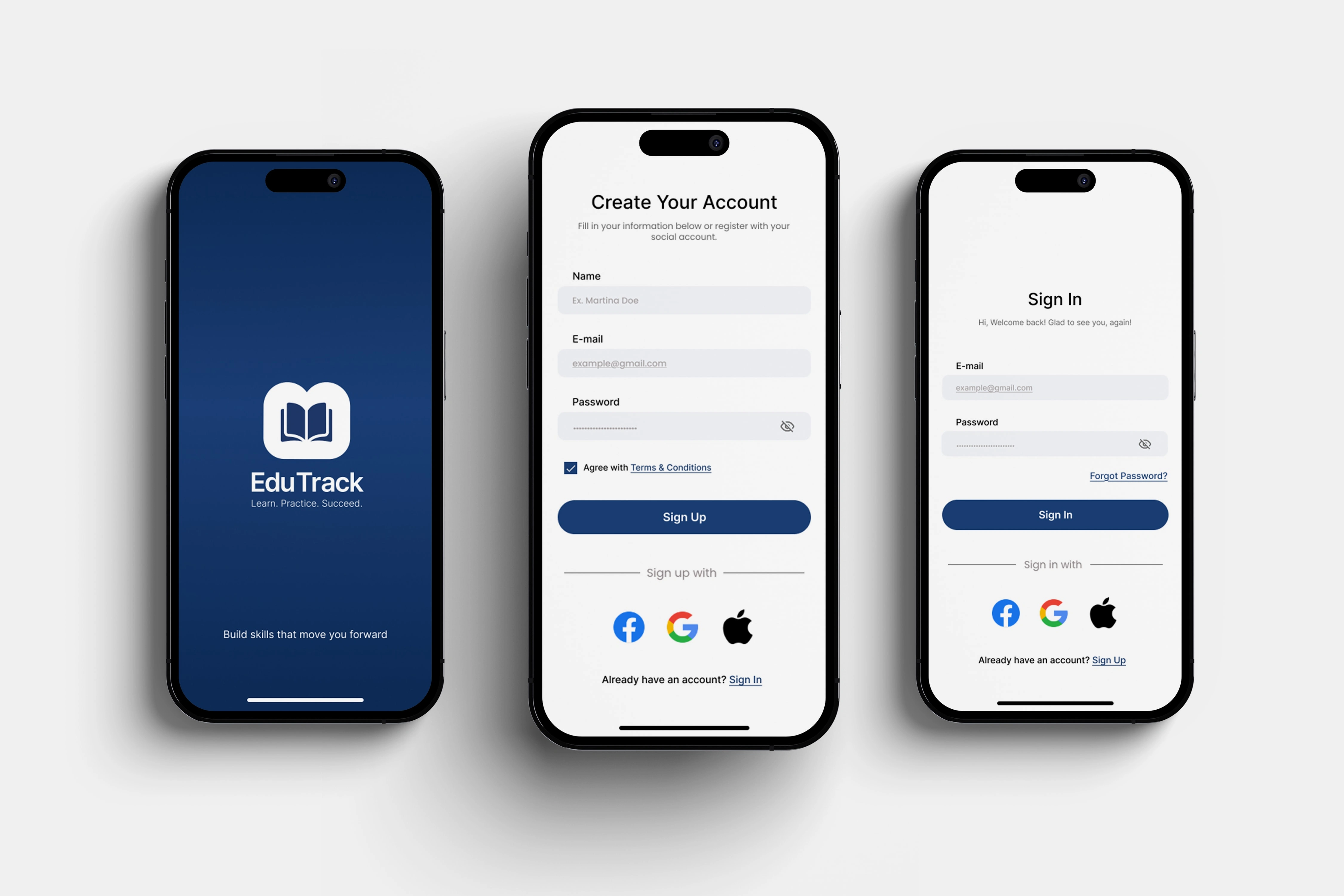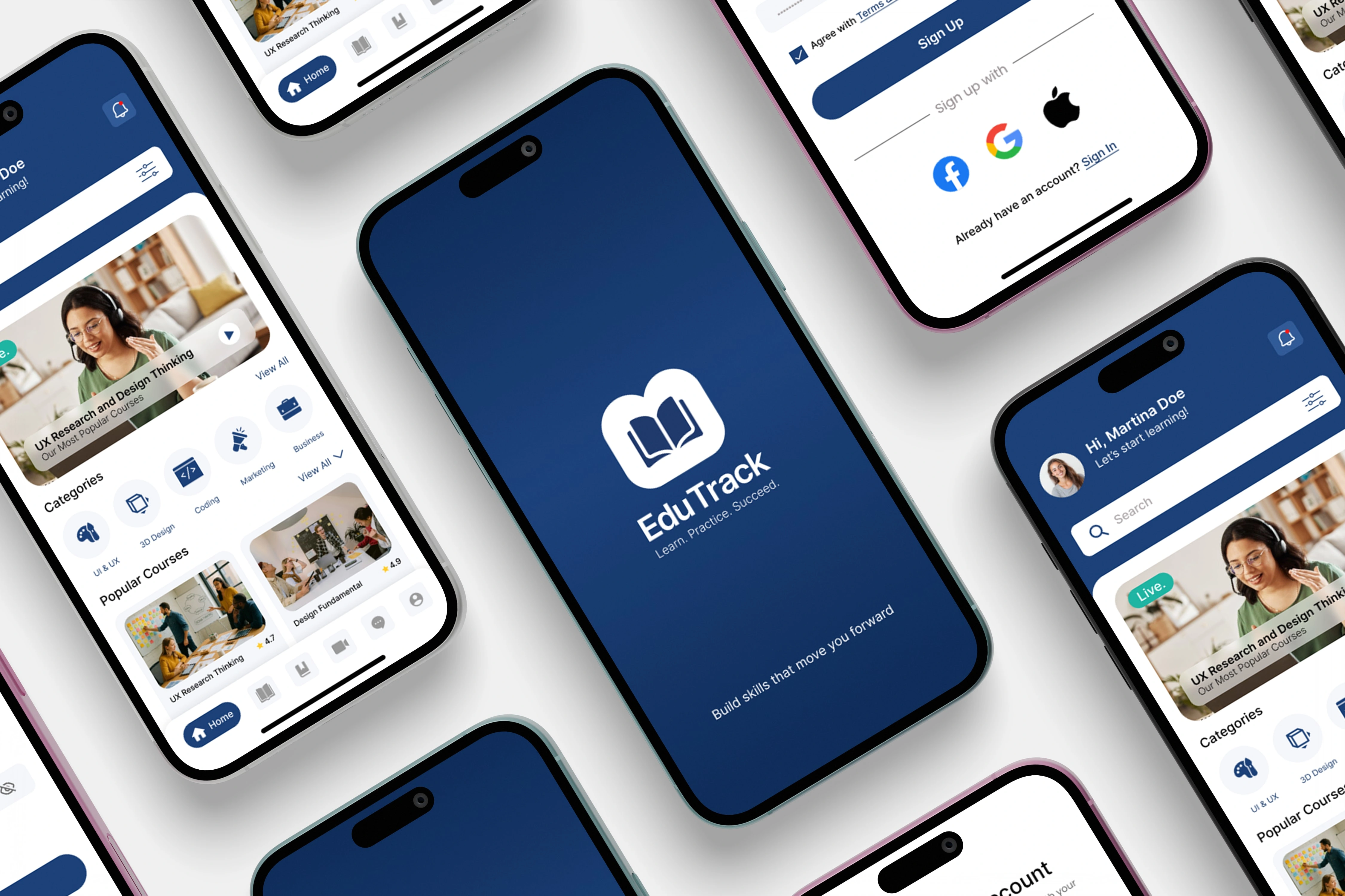 EduTrack is a clean, modern education app UI with simple layouts, clear hierarchy, and smooth navigation to explore courses,track progress, and manage profiles.