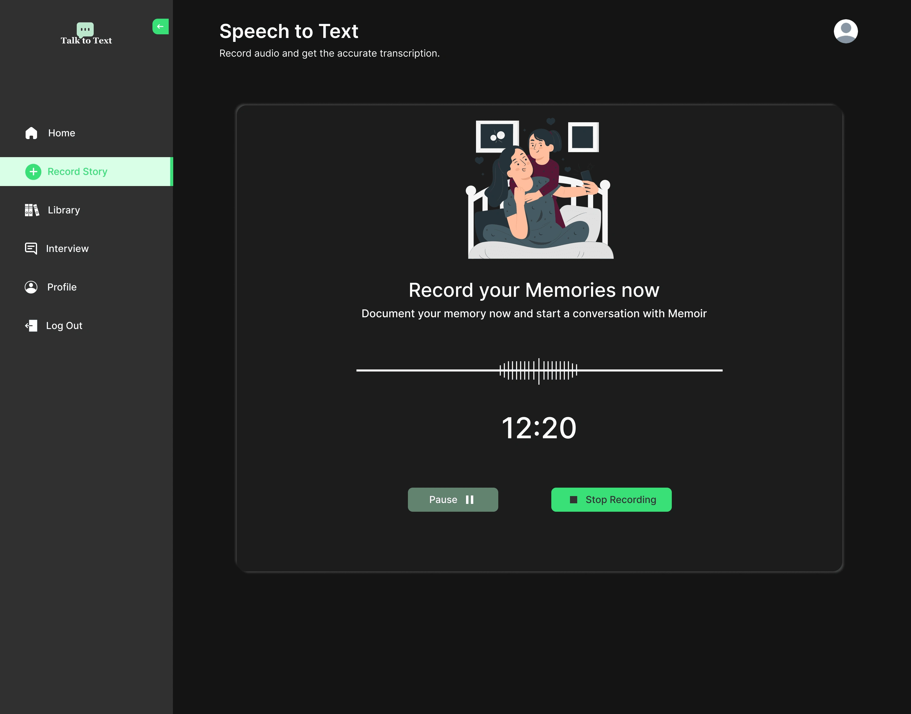 Research, strategise and design a PWA (progress web app) experience user record, document their memories, and hold a conversation with an AI based on the story recorded.