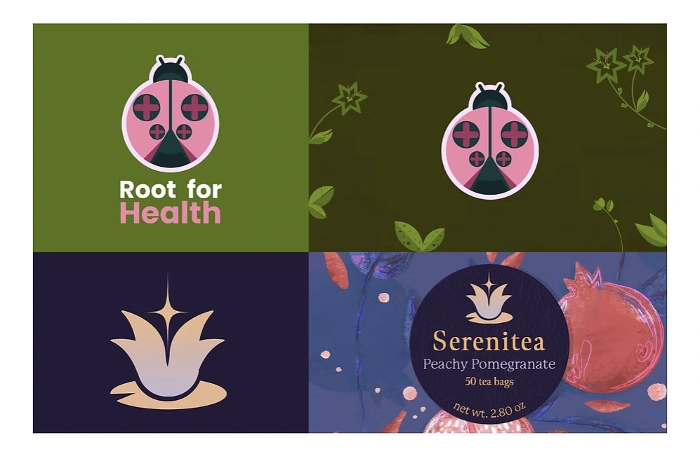 The following are 2 different logo developments with a side-by-side display of their application with additional pattern assets.