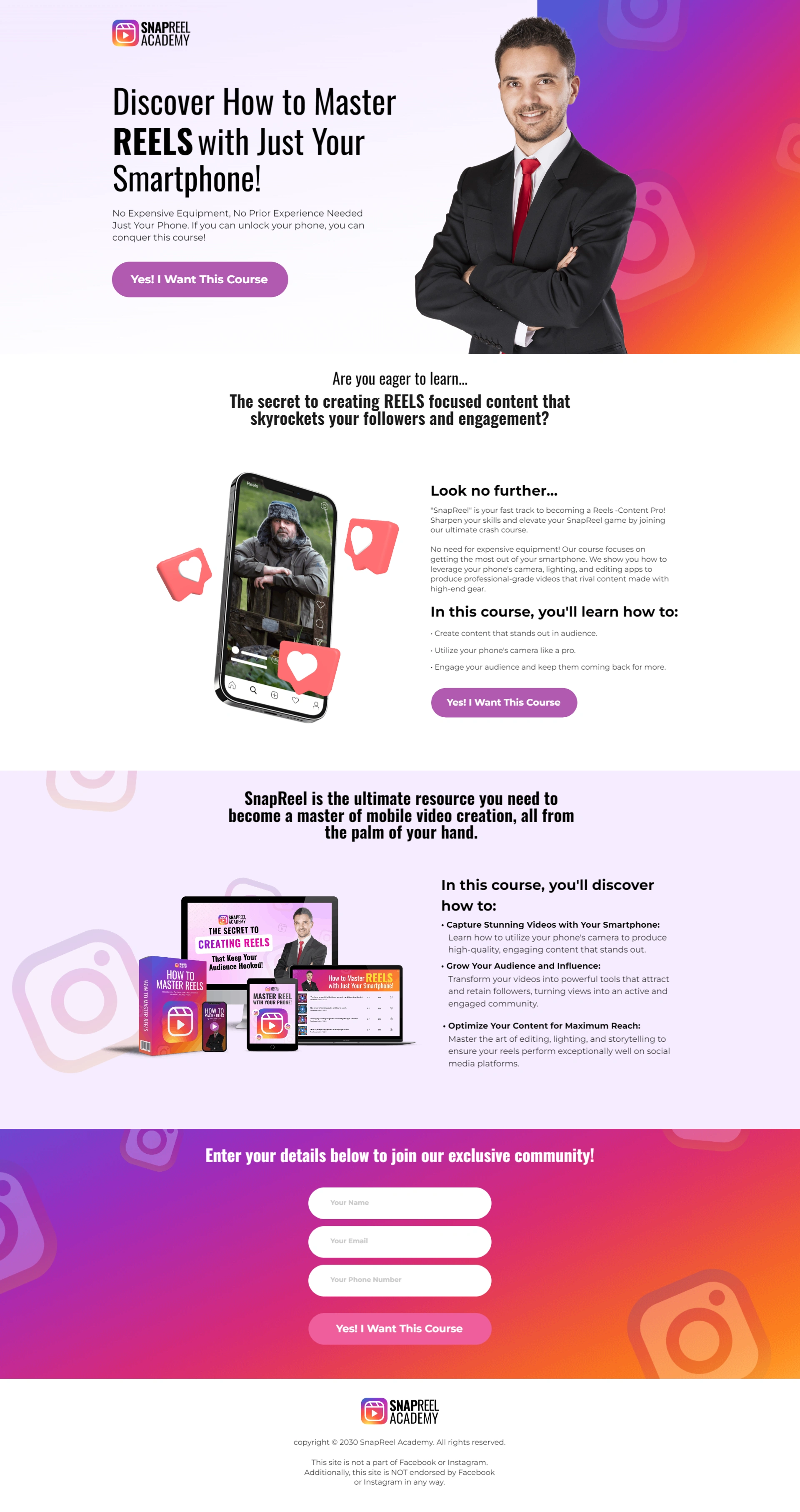 This project involved creating a high-converting course landing page for Snapreal Academy, designed to help users master Instagram Reels using only their smartphones. The goal was to clearly communicate the value of the course, showcase key benefits, and drive enrollments through a visually engaging and user-friendly layout.