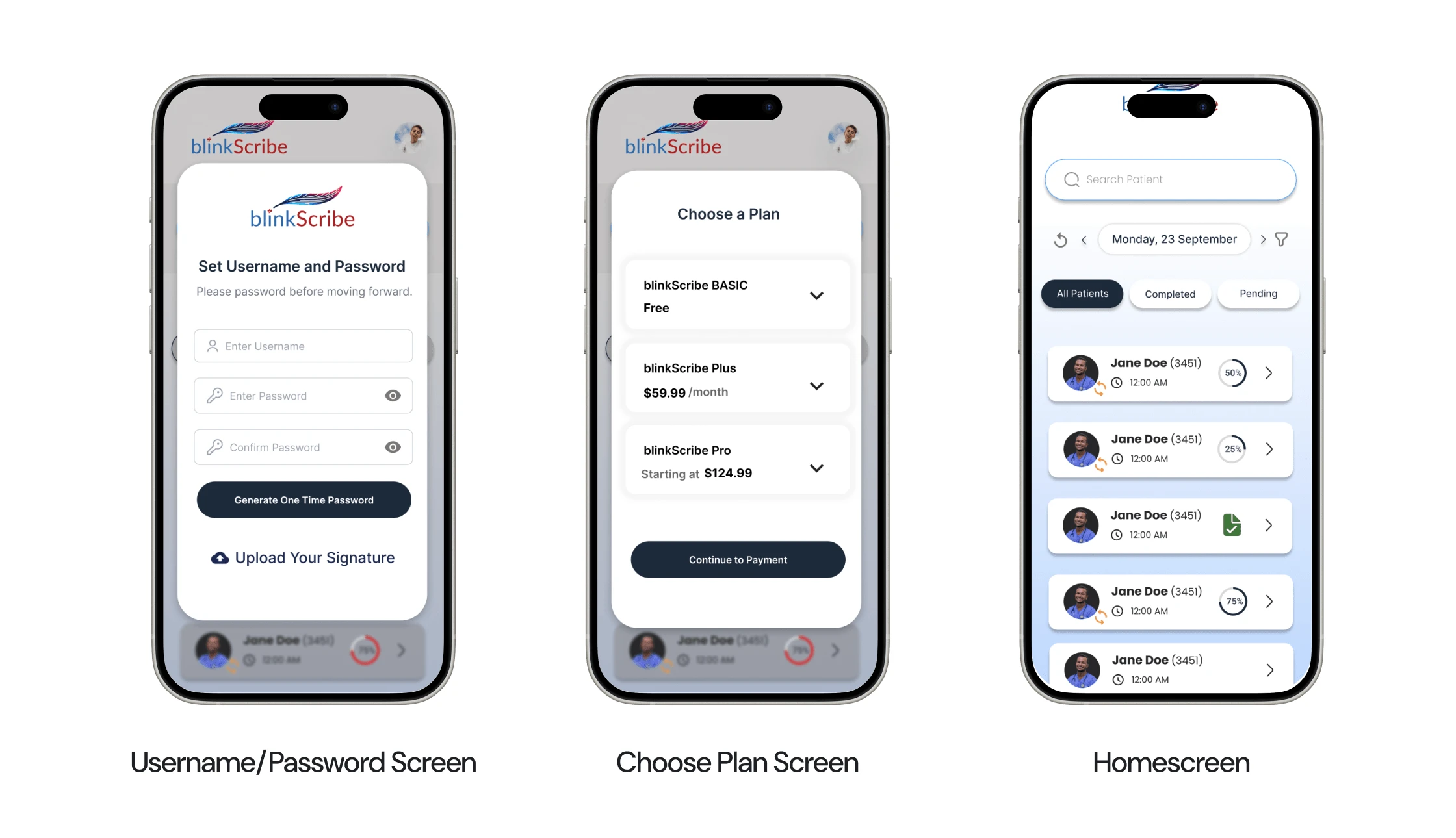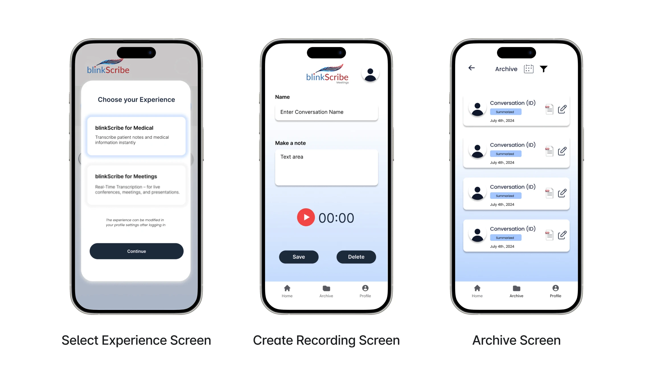blinkScribe - A comprehensive mobile application designed for healthcare professionals to create detailed SOAP notes through voice recording. The app features an intuitive recording interface, secure account management, flexible subscription plans, and an organized archive system for managing patient documentation.