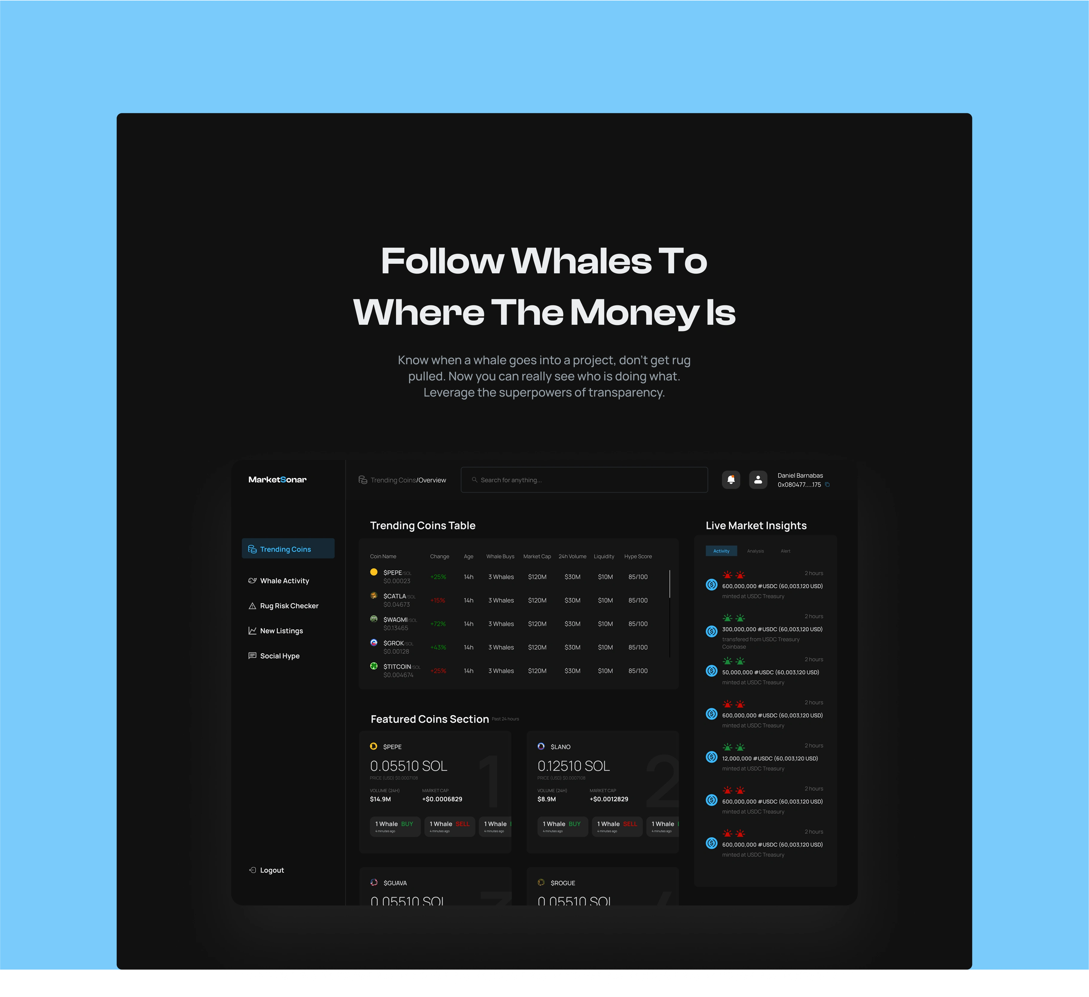 For the dashboard, I designed a dark, data-first interface with real-time charts, wallet activity feeds, and clear signal highlights, giving traders confidence in their next move.
