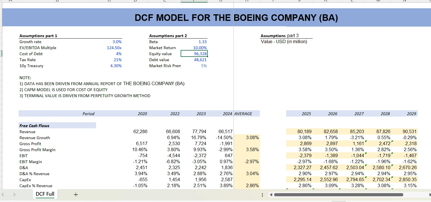 Developed a comprehensive Discounted Cash Flow (DCF) model for The Boeing Company, analyzing its financial performance and intrinsic value.