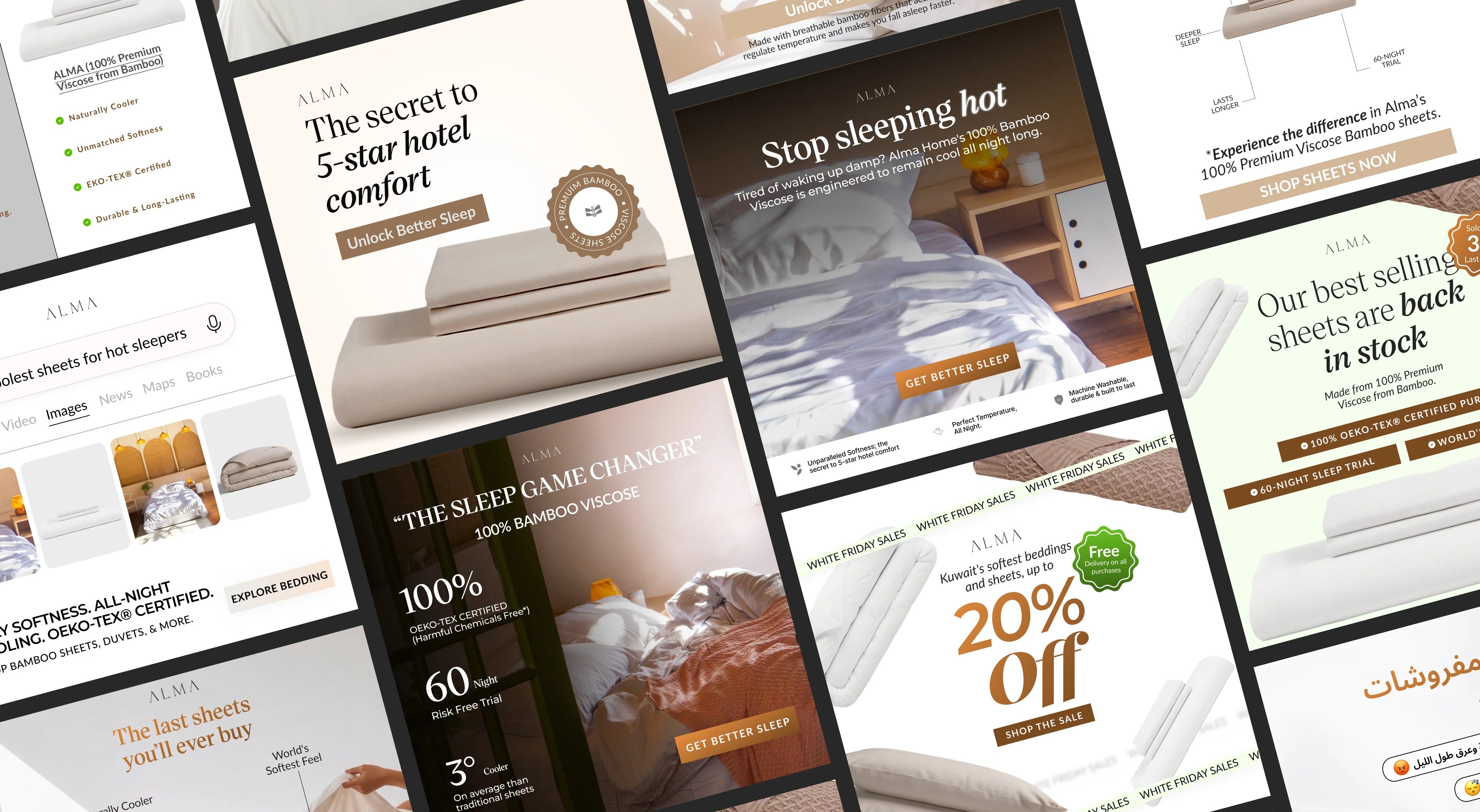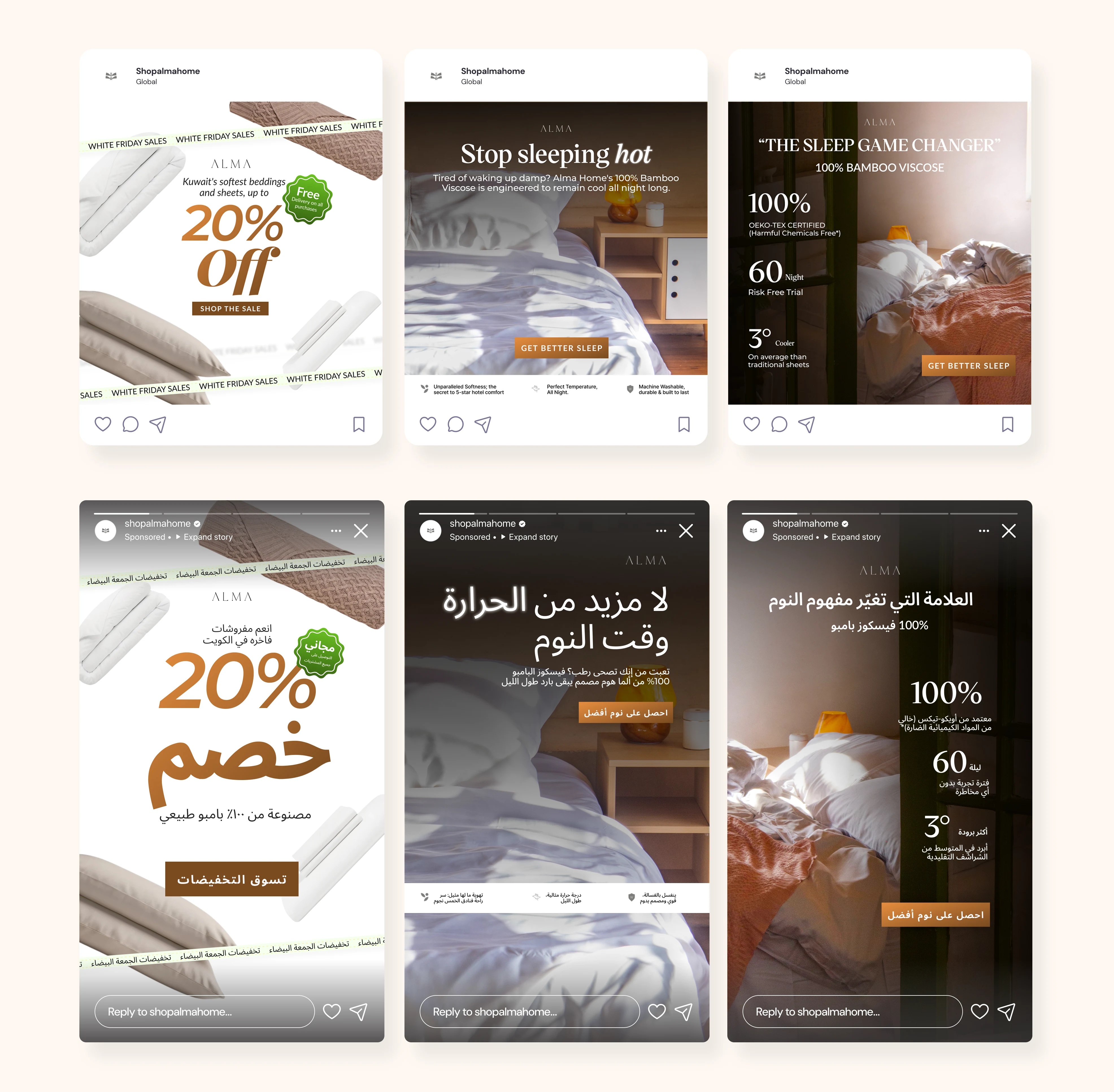 Alma Home came to me needing scroll-stopping Meta ads that could do three things at once: look unmistakably luxurious, respect Kuwait's cultural sensibilities, and actually convert viewers into customers. They also needed Arabic variations that felt natural, not just translated, for their Kuwait audience.