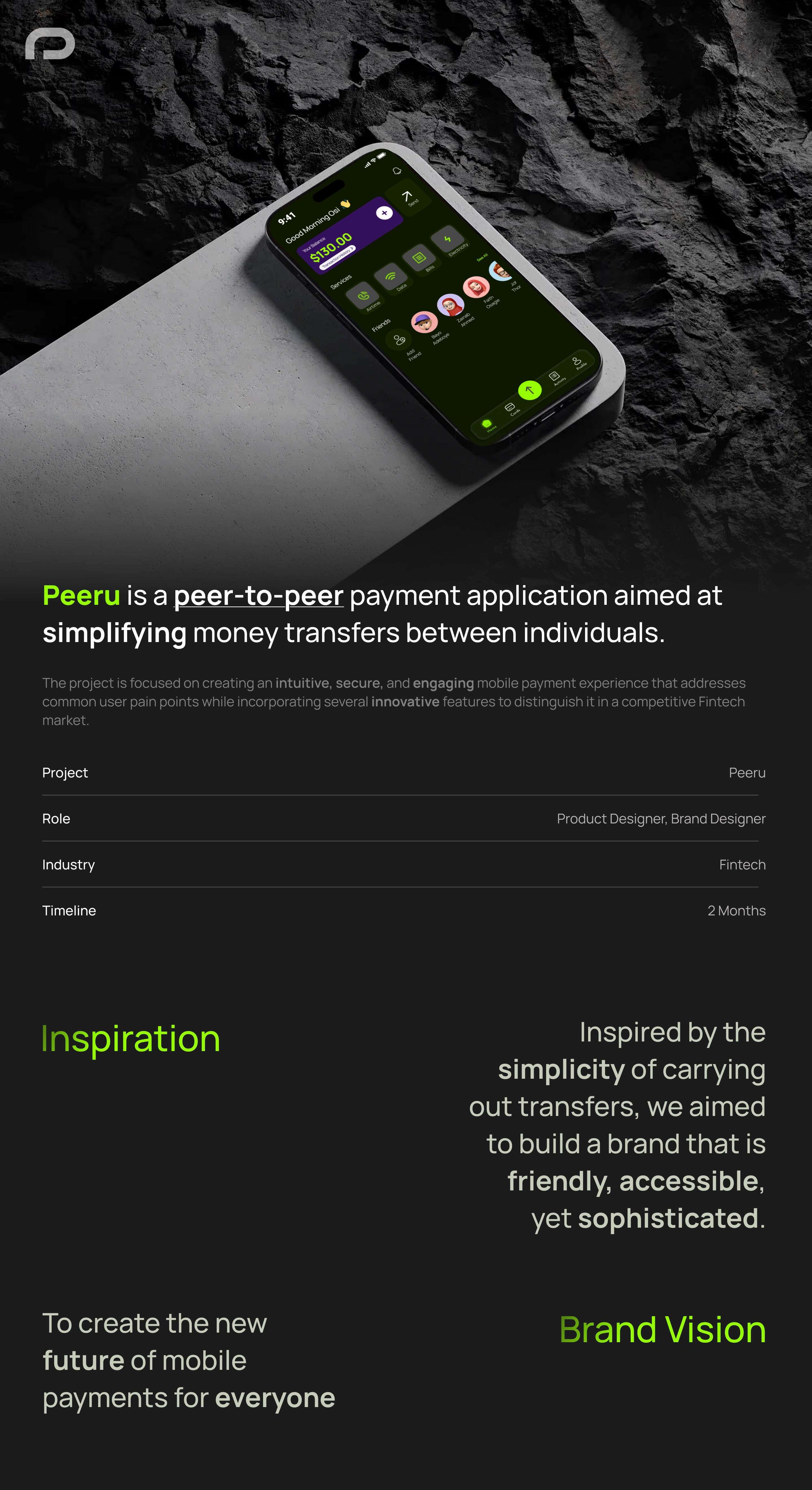 Peeru is a Peer-to-Peer payment application aimed at simplifying money transfers between individuals through an intuitive, secure and engaging mobile interface.