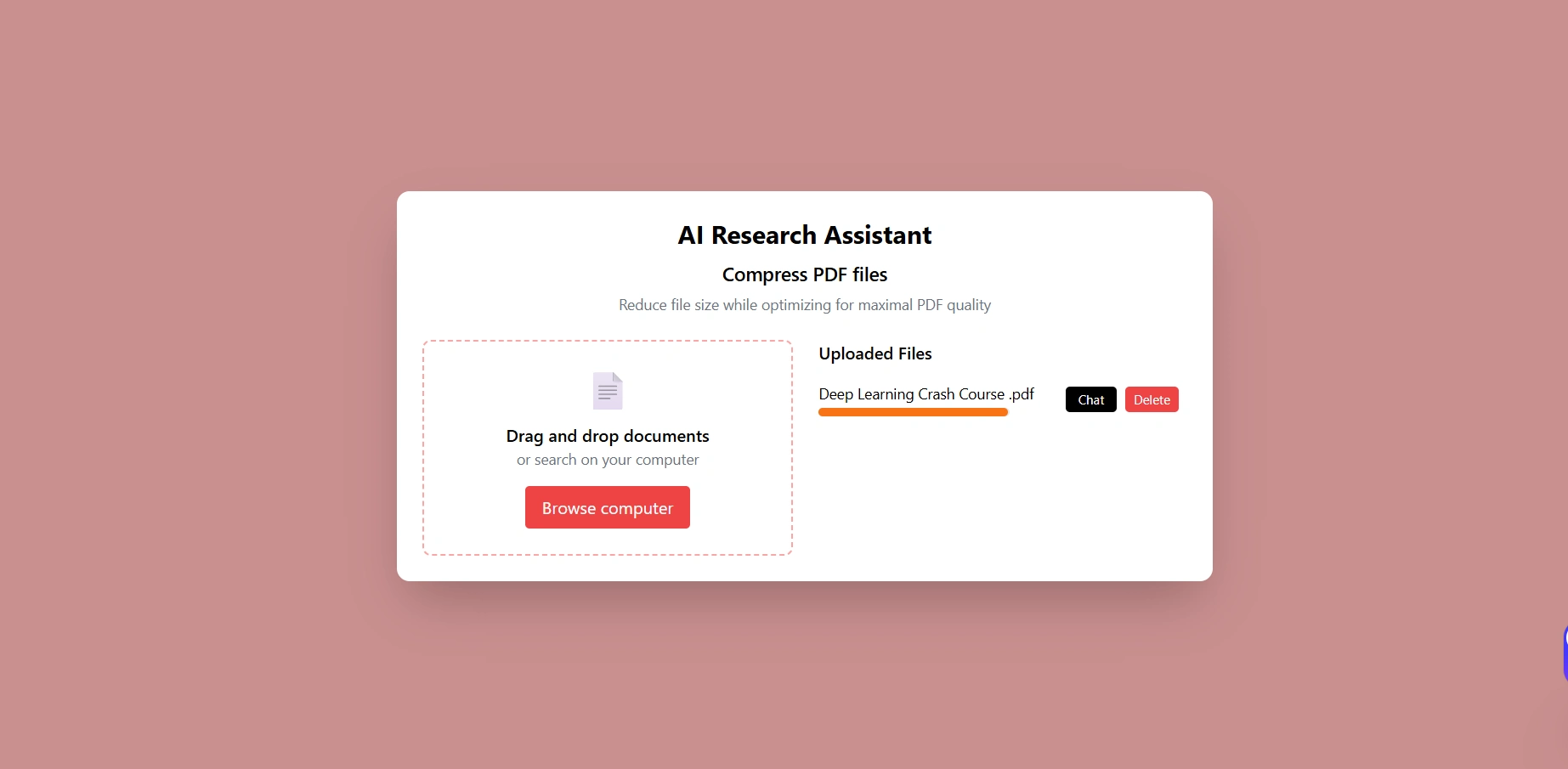 Feature Description ๐ PDF Upload & Processing Extract, chunk, and embed document text on upload ๐ฌ Conversational Chat Ask questions in natural language, get contextual answers ๐ Semantic Search Vector embeddings power similarity-based retrieval ๐ Source Attribution Responses traced back to specific document chunks ๐ง RAG Pipeline Full retrieval-augmented generation implementation ๐พ Persistent History Conversation saved across sessions โก Real-Time Chat UI Auto-scroll, loading states, smooth interaction ๐๏ธ PDF Preview In-app document viewer with page navigation