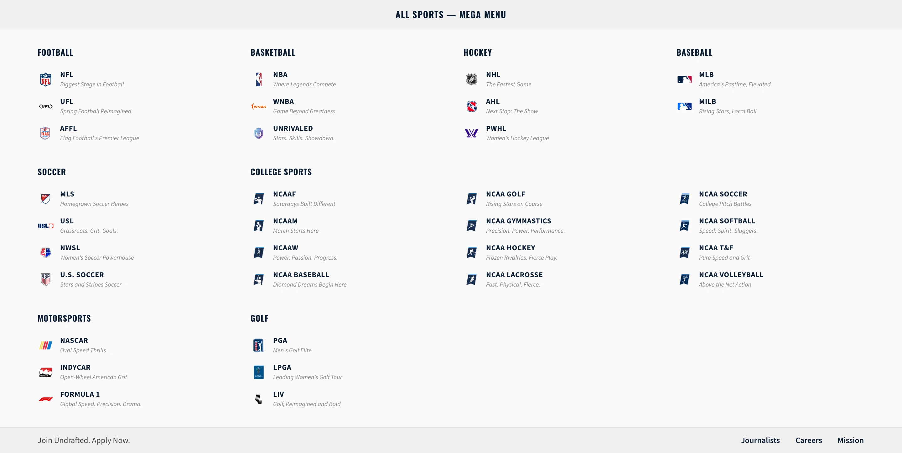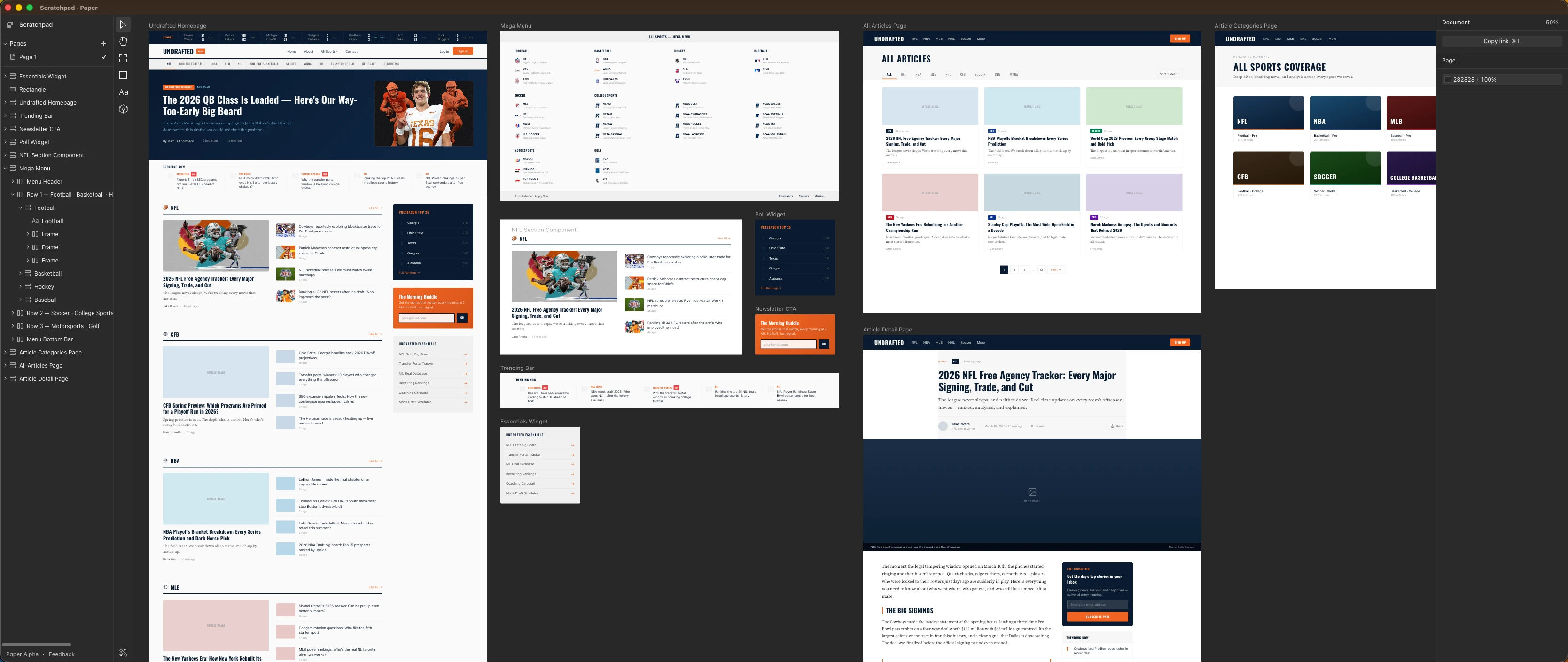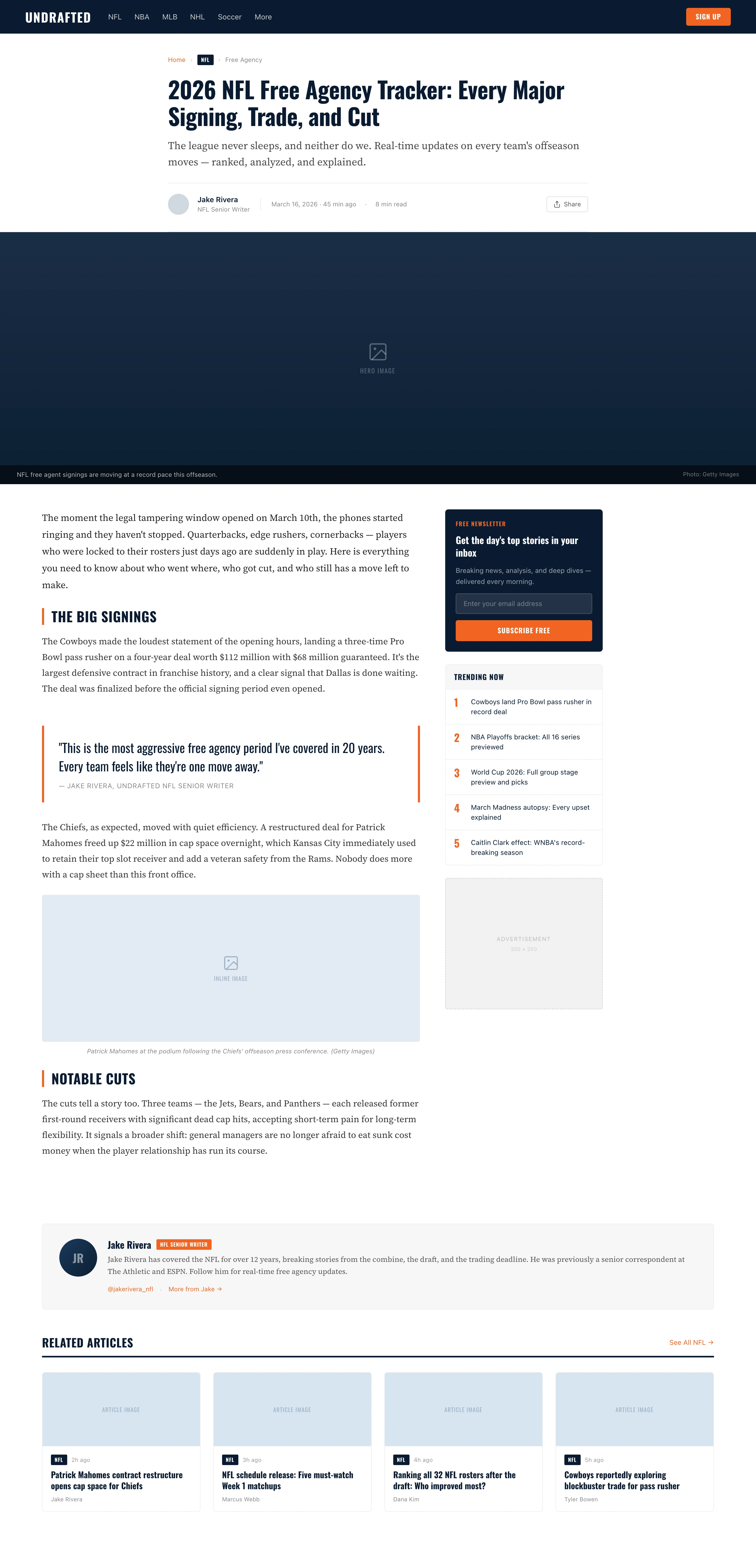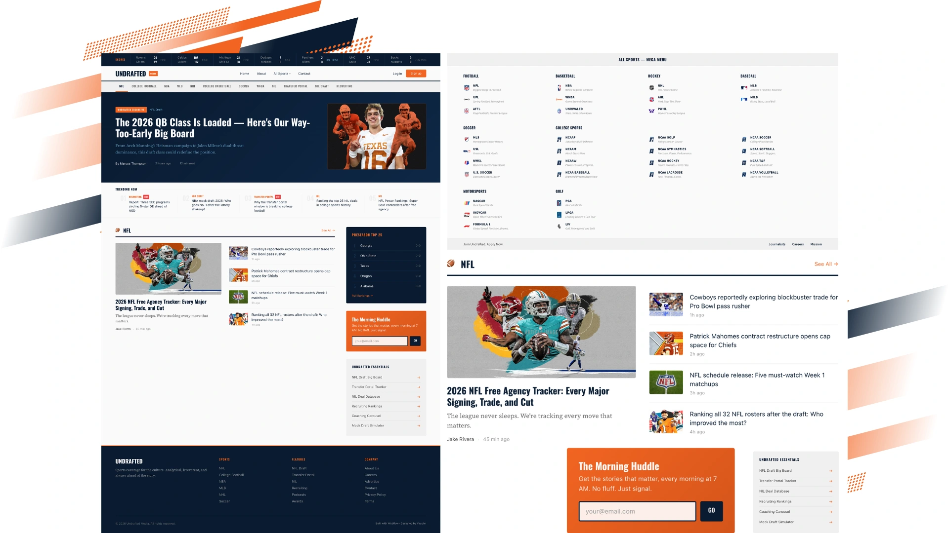Undrafted covers a wide range of sports. From NFL and NBA to NCAA sports, motorsports, and soccer, the platform needs to organize a massive amount of editorial content while still feeling fast and readable.