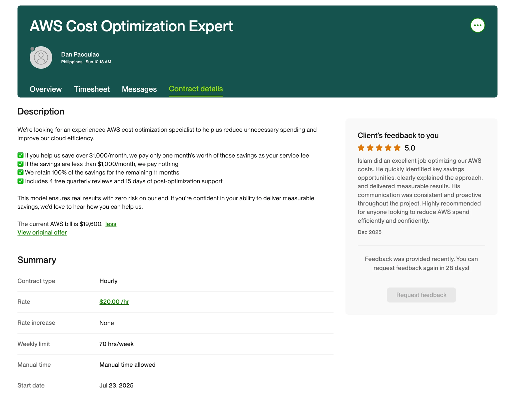 An experienced AWS cost optimization specialist to help us reduce unnecessary spending. Deliverables: Save over $1,000/month to get your service fee (1 month)