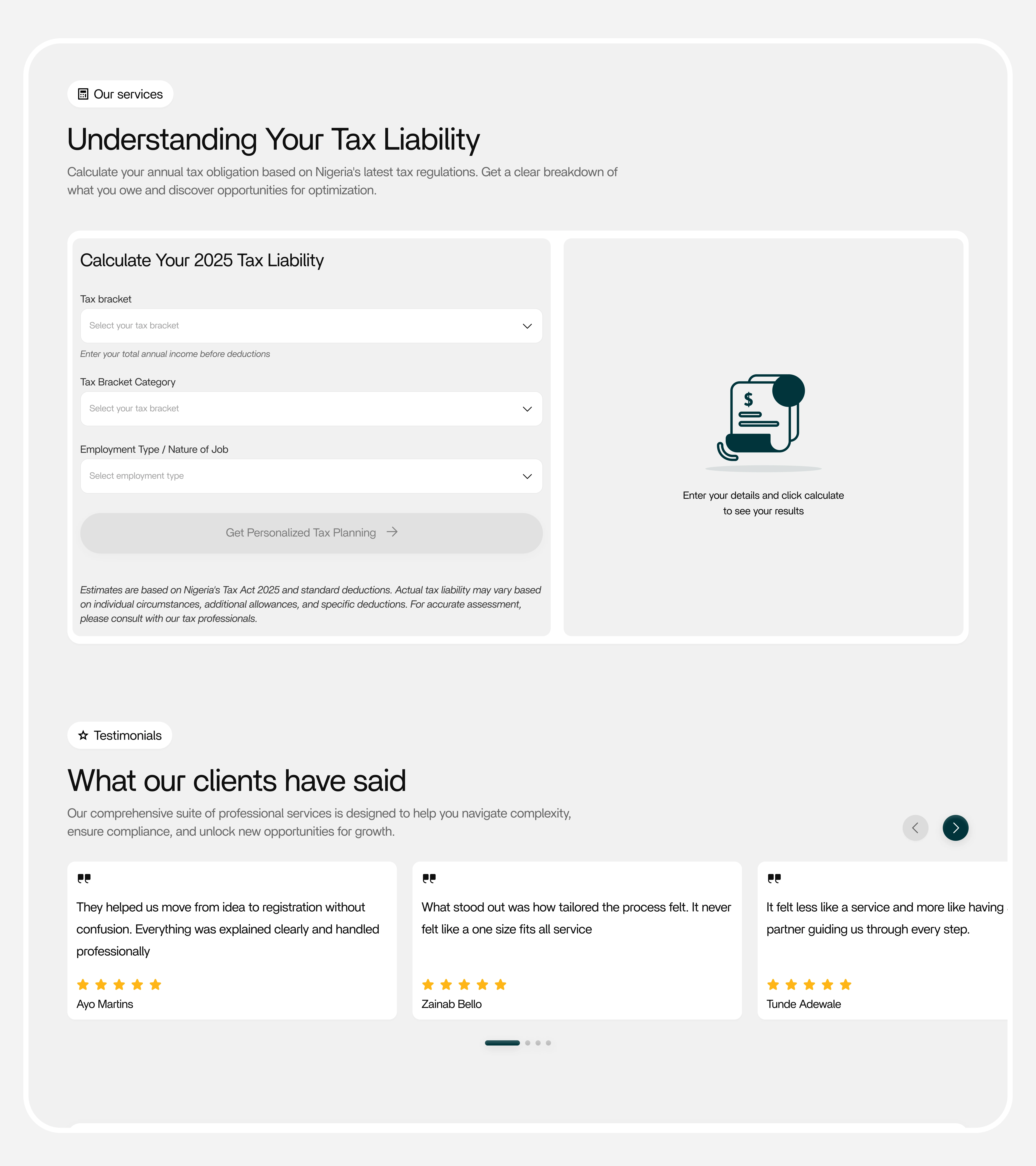 The calculator also needed to do two things: help users estimate their tax liability and drive consultation bookings.