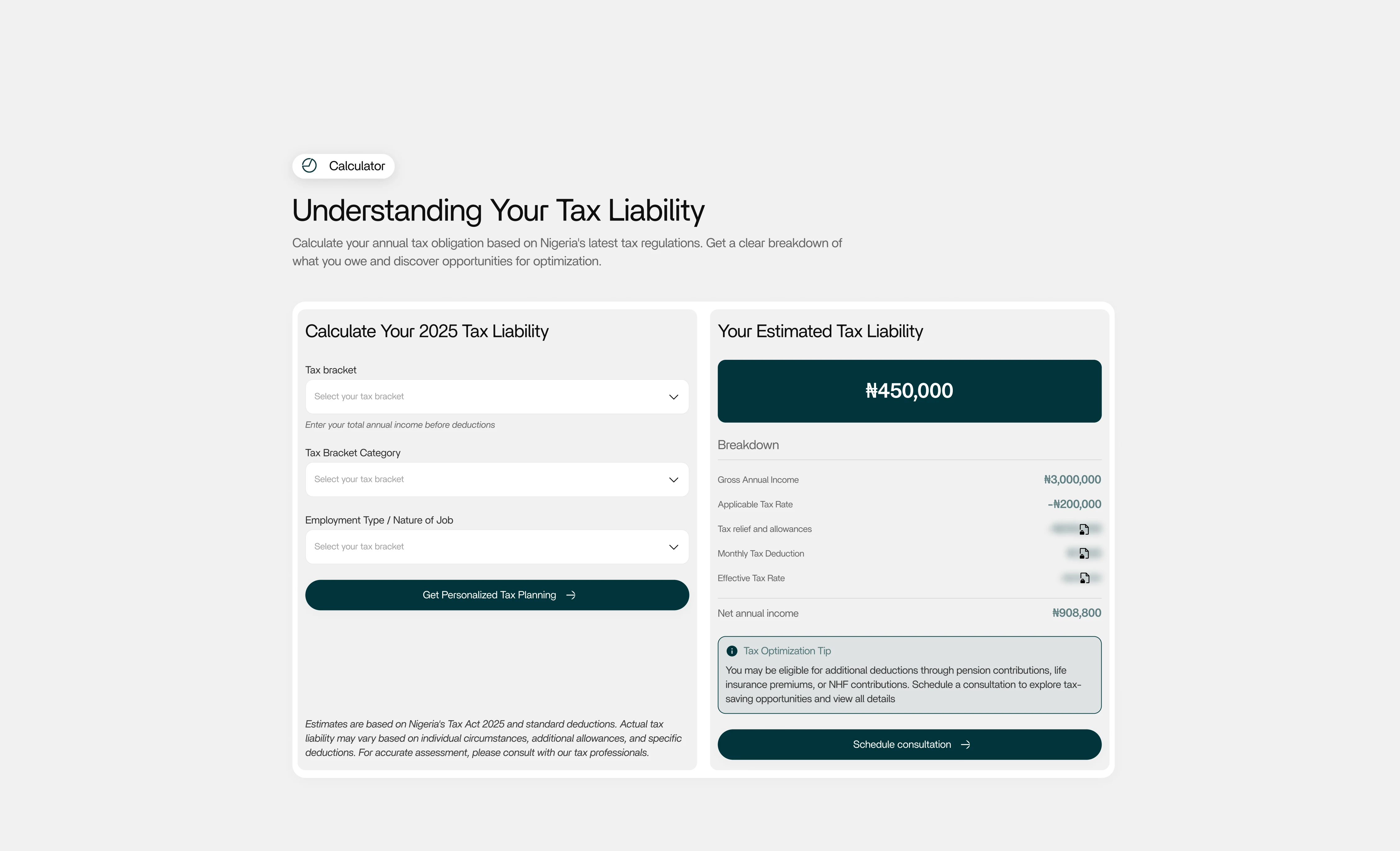 Once they had their details in, it showed the liability number upfront (₦450,000) , clear and immediate. But locked the detailed breakdown behind a consultation. Give enough value to build trust, withhold enough detail to create urgency.
