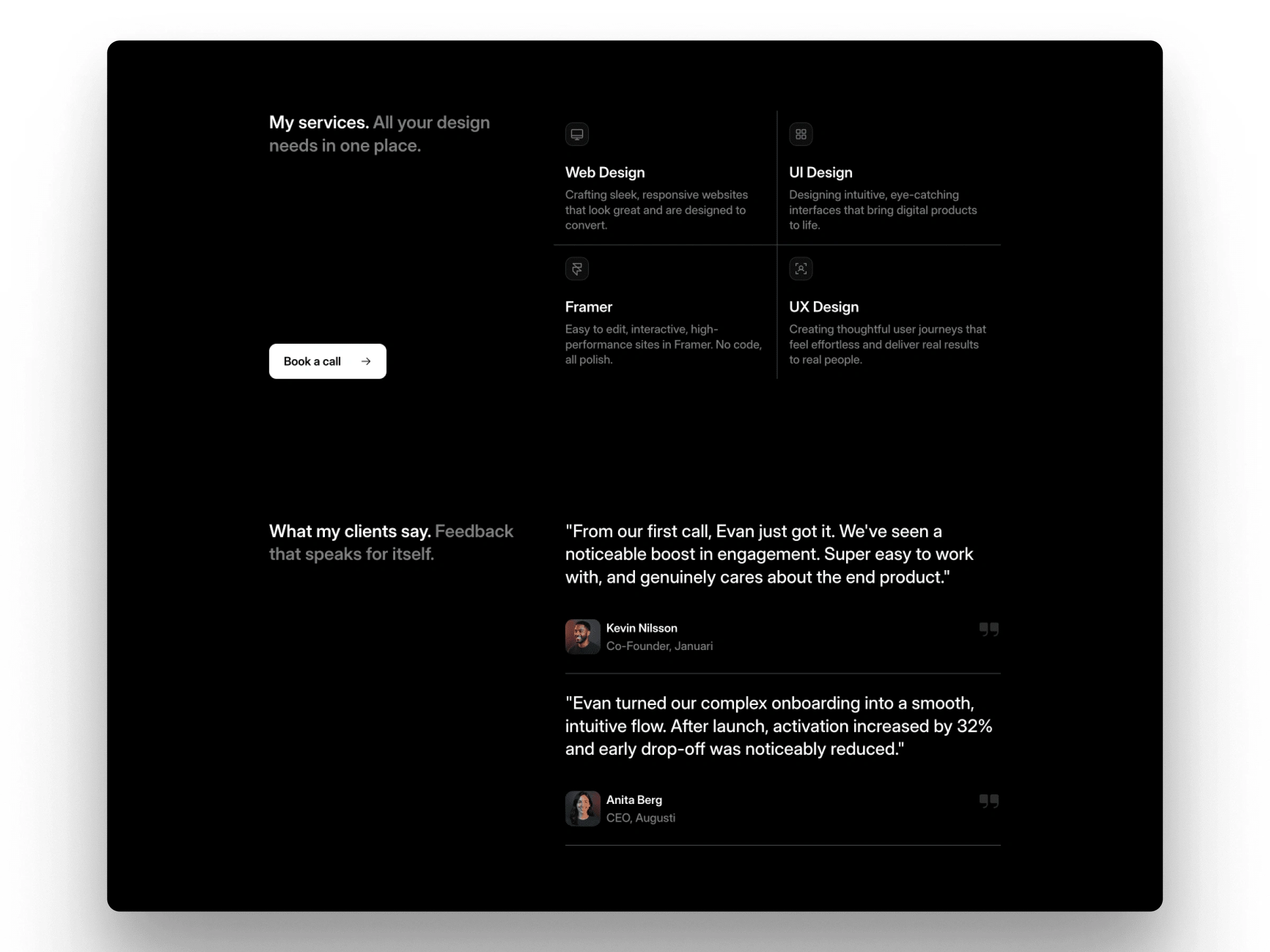 Stilren is a sleek and minimal Framer template made for freelancers and agencies specializing in UI/UX, web design, and no-code development. Clean layouts, top-notch typography, and a timeless aesthetic make it the perfect foundation for a standout portfolio.