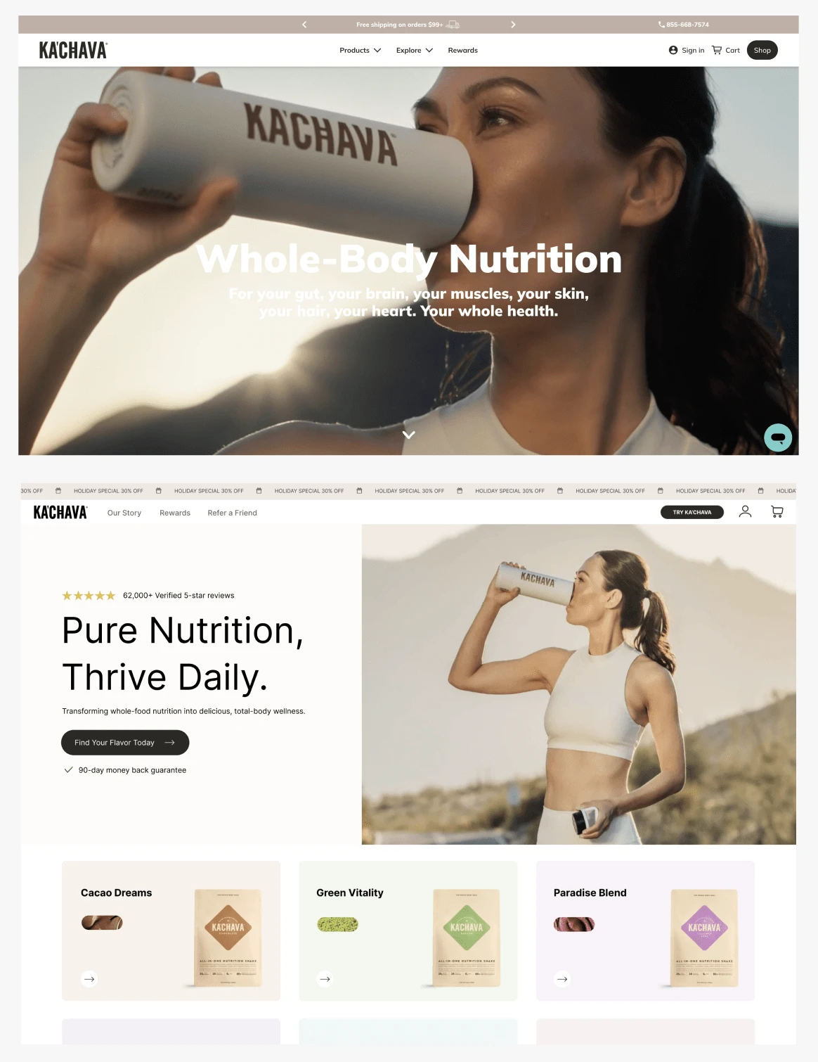 A strategic homepage redesign for Kachava that elevates social proof, streamlines navigation, and showcases products above the fold while maintaining their..