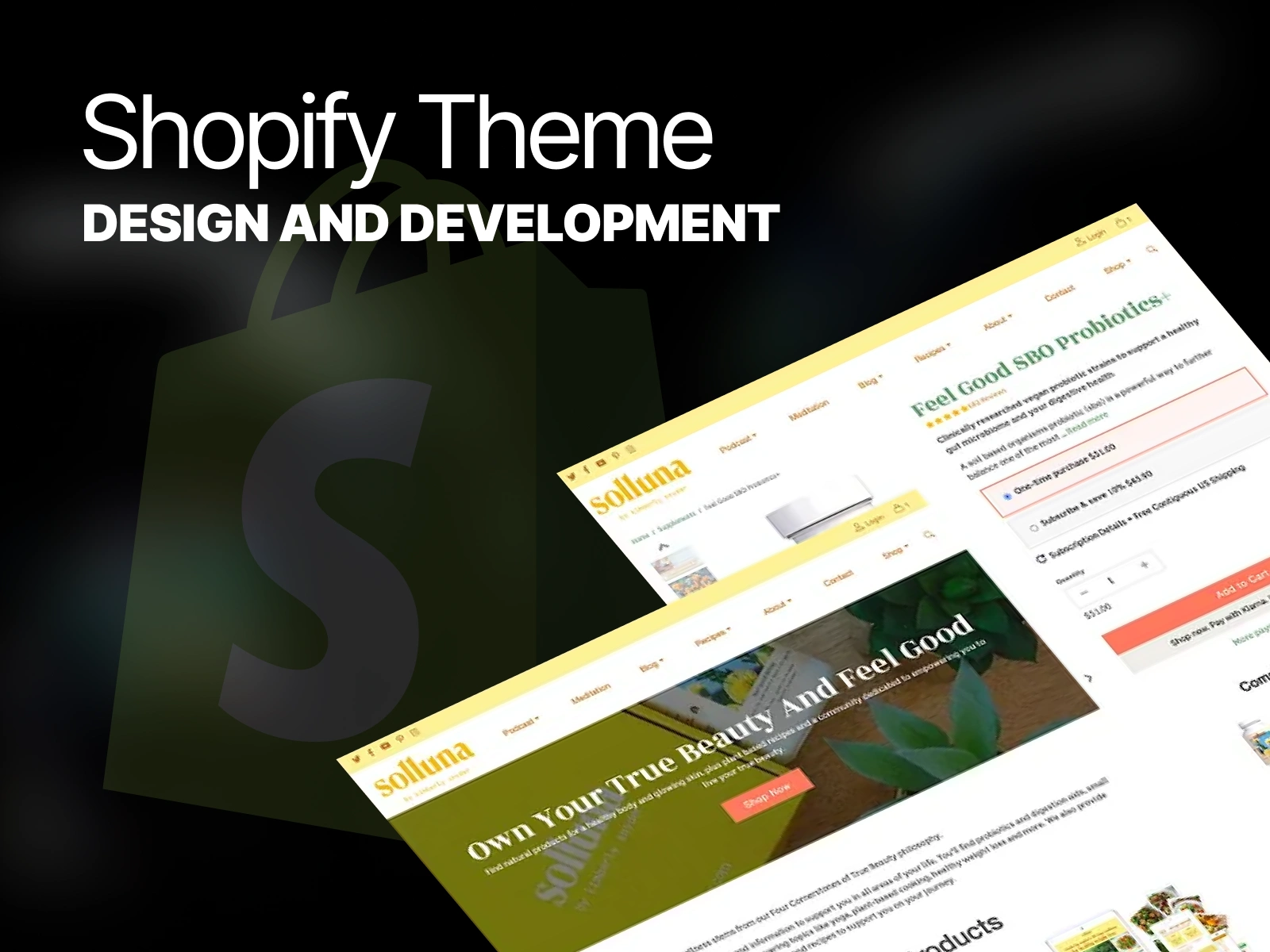 Custom Shopify theme design and development for Solluna by Kimberly Snyder, a holistic wellness brand focused on beauty and health products. The project involved creating a comprehensive e-commerce experience that reflects the brand's "Four Cornerstones of True Beauty" philosophy.