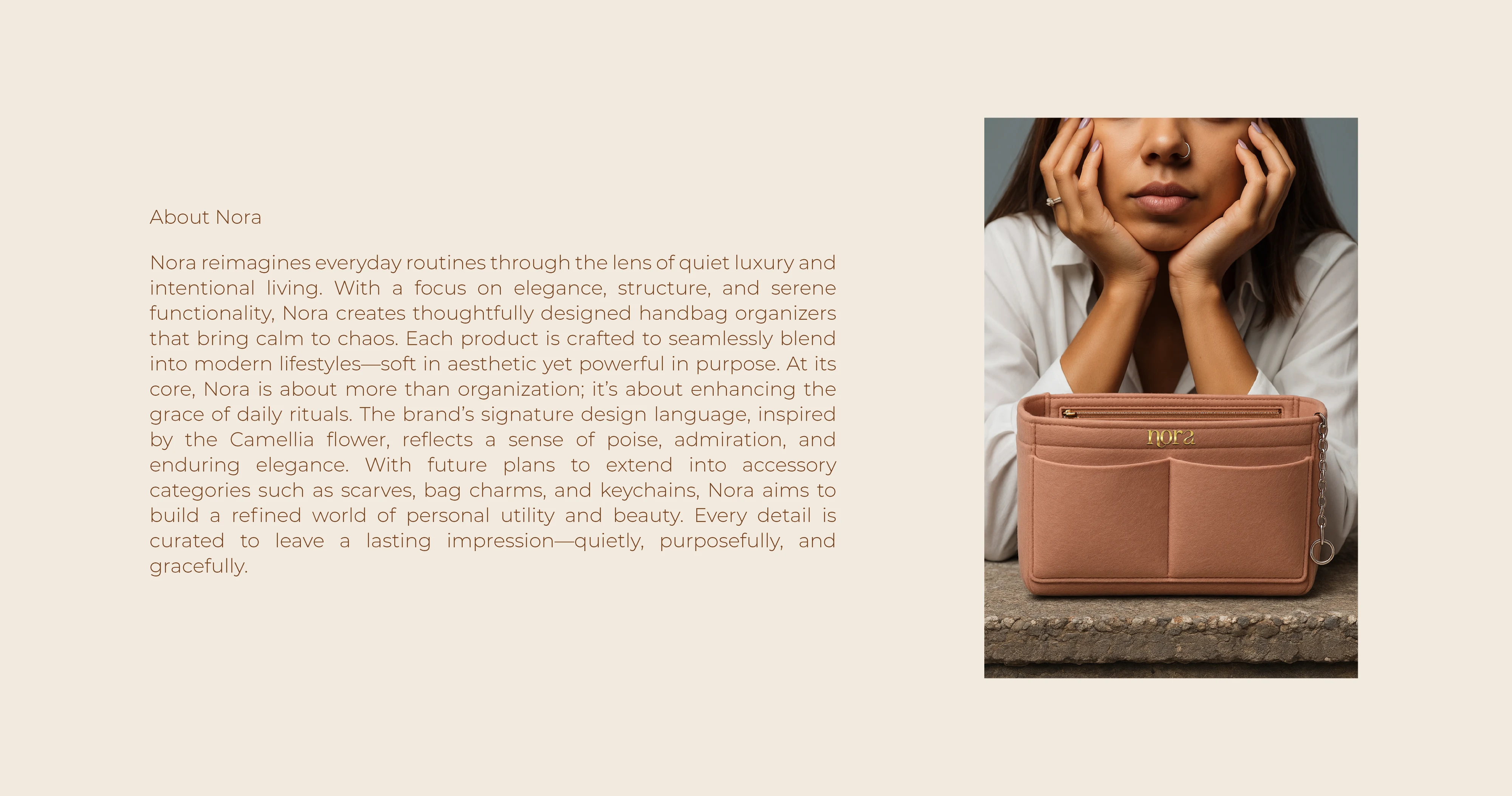 Nora is a symbol of quiet luxury, structure, and effortless elegance that feels graceful yet purposeful, reflecting the refined routine of modern women.