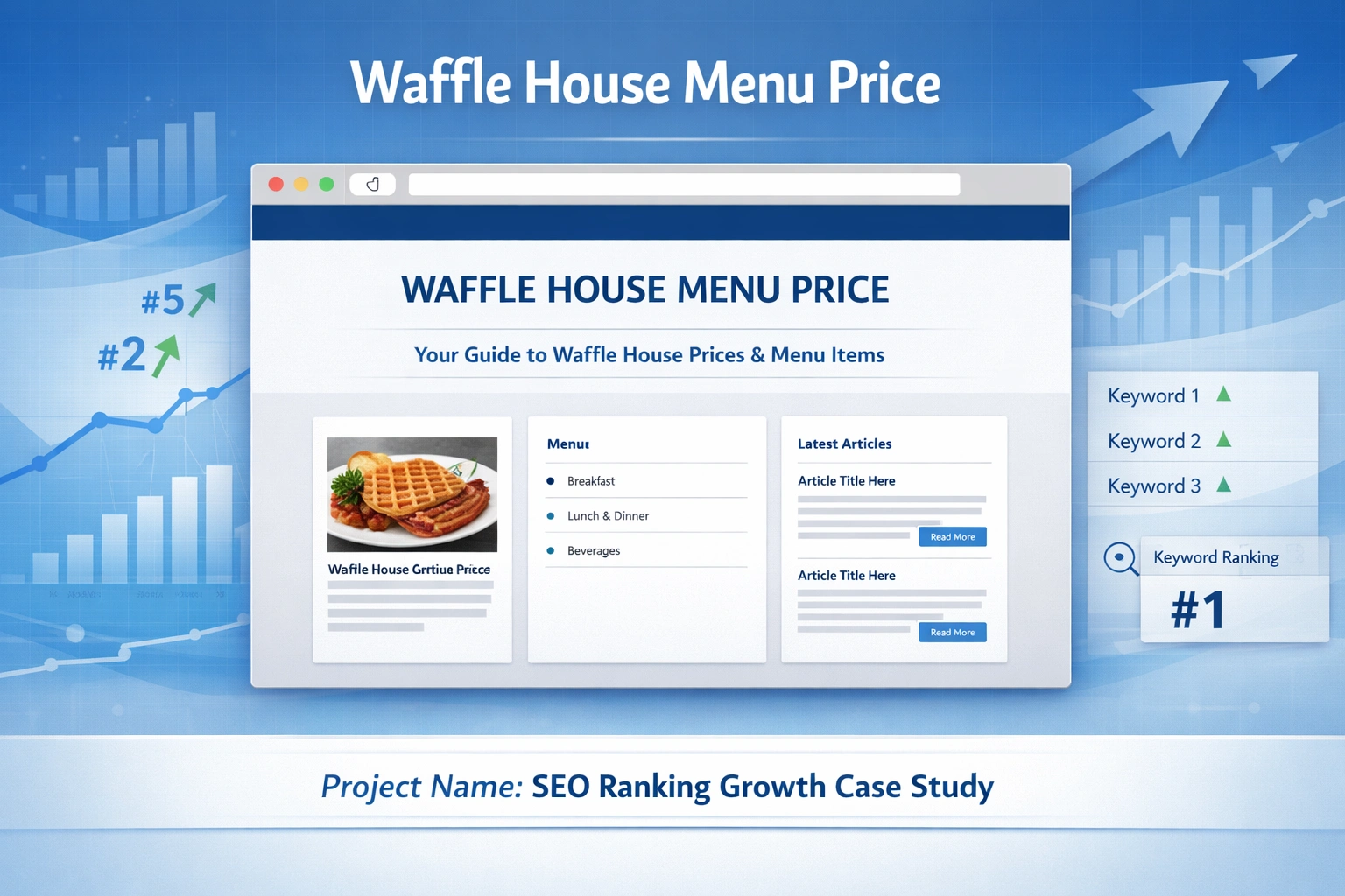 This case study outlines the design, development, and execution of a comprehensive SEO strategy for Waffle House Menu Prices, a USA-based informational website created to help users easily access Waffle House menu items, pricing details, store locations, and online ordering information. The primary objective was to build a user-friendly, search-optimized platform that serves breakfast, lunch, and dinner search intent while achieving strong organic visibility in the U.S. market.
