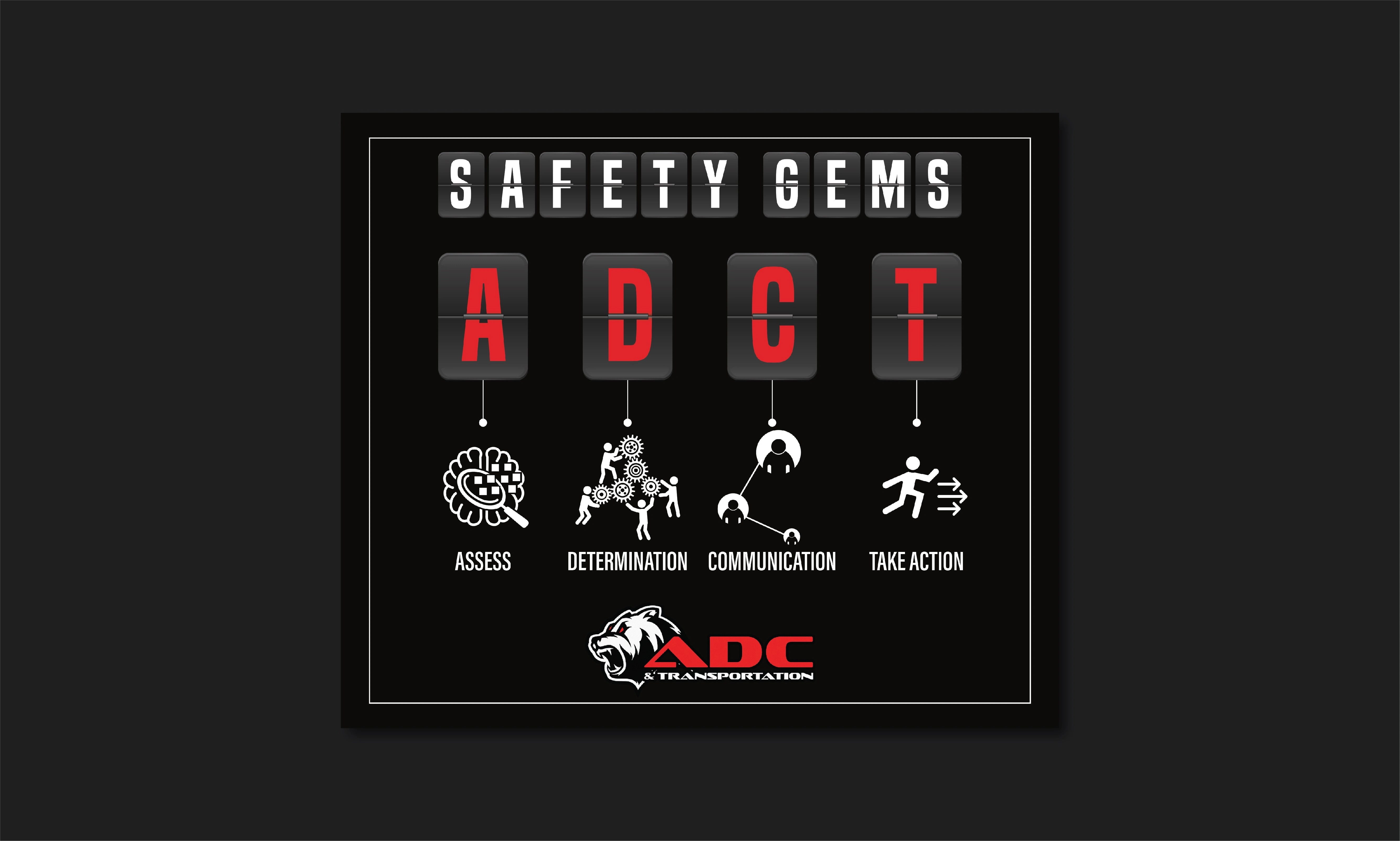 Visual safety awareness infographic explaining the ADCT framework—Assess, Determination, Communication, and Take Action—for workplace and transportation safety.