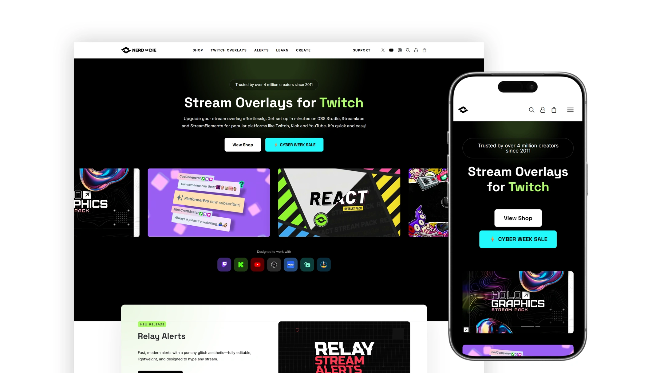 Nerd Or Die is a long-running, design-led platform for stream overlays, widgets, and digital assets used by creators across Twitch, YouTube, and Kick. What began as a small side project has grown into a multi-category creative brand that has served millions of users over 10 years of partnership with the founder. We've shaped, and continuously evolved through end-to-end design, development, and marketing.
