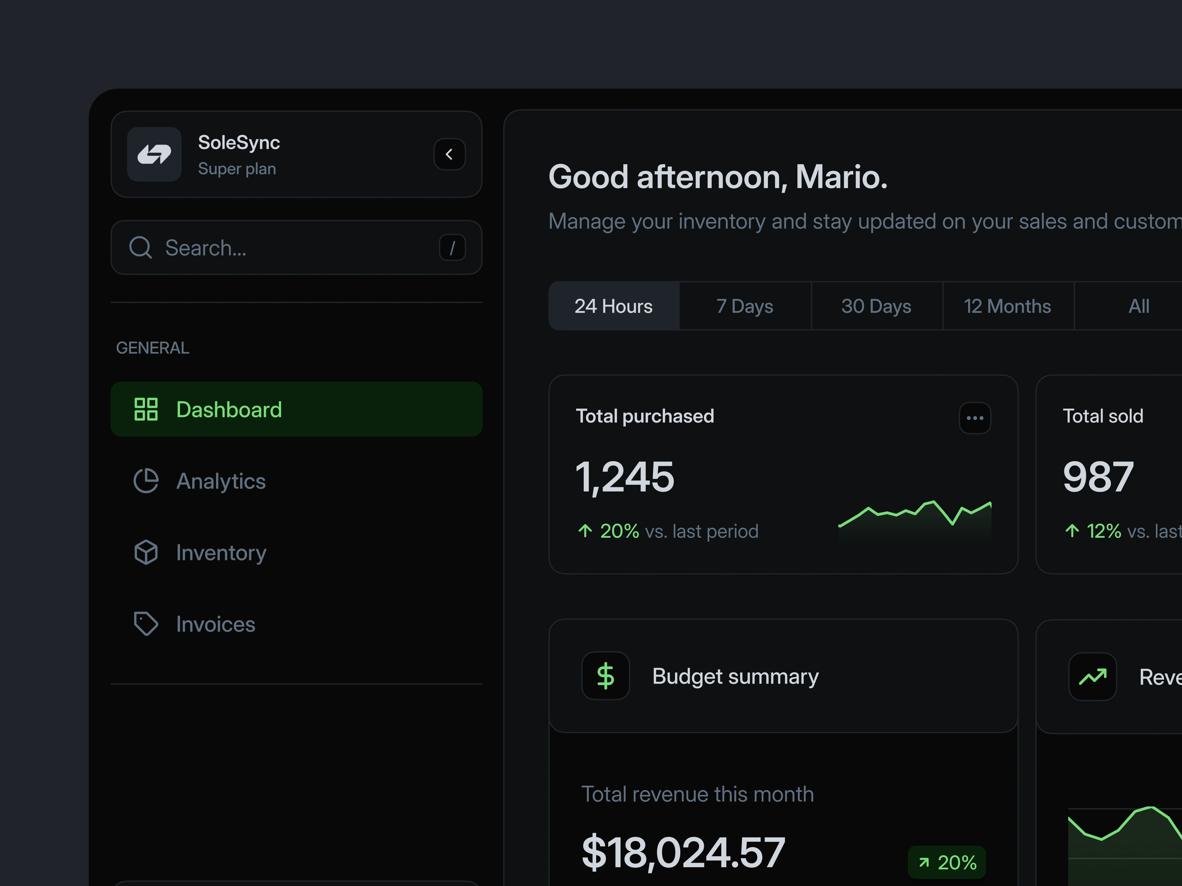 A clean, intuitive dashboard designed for sneaker resellers to stay on top of sales, purchases, and inventory. The interface highlights key metrics, revenue summaries, and sales trends — making data actionable at a glance.