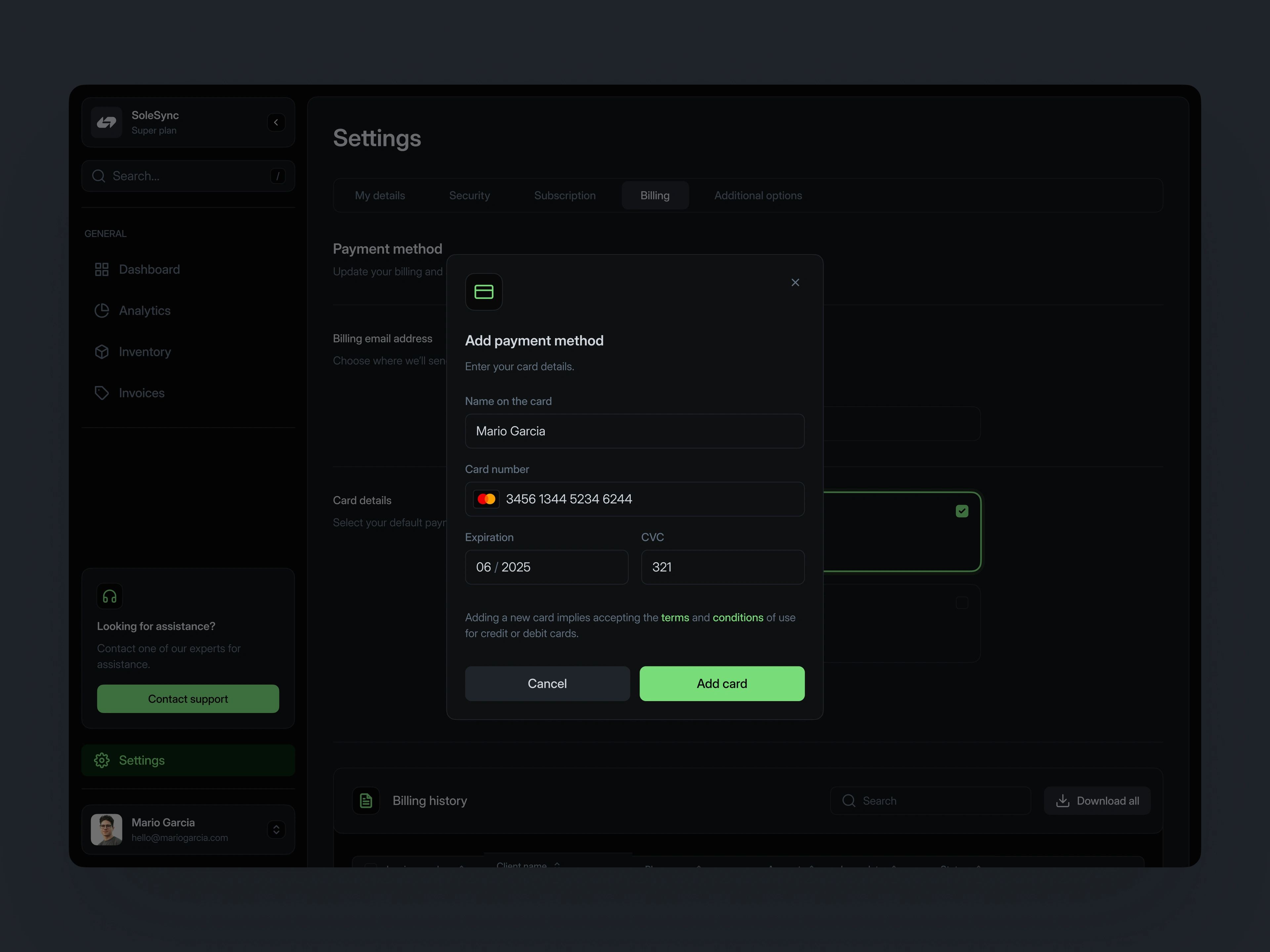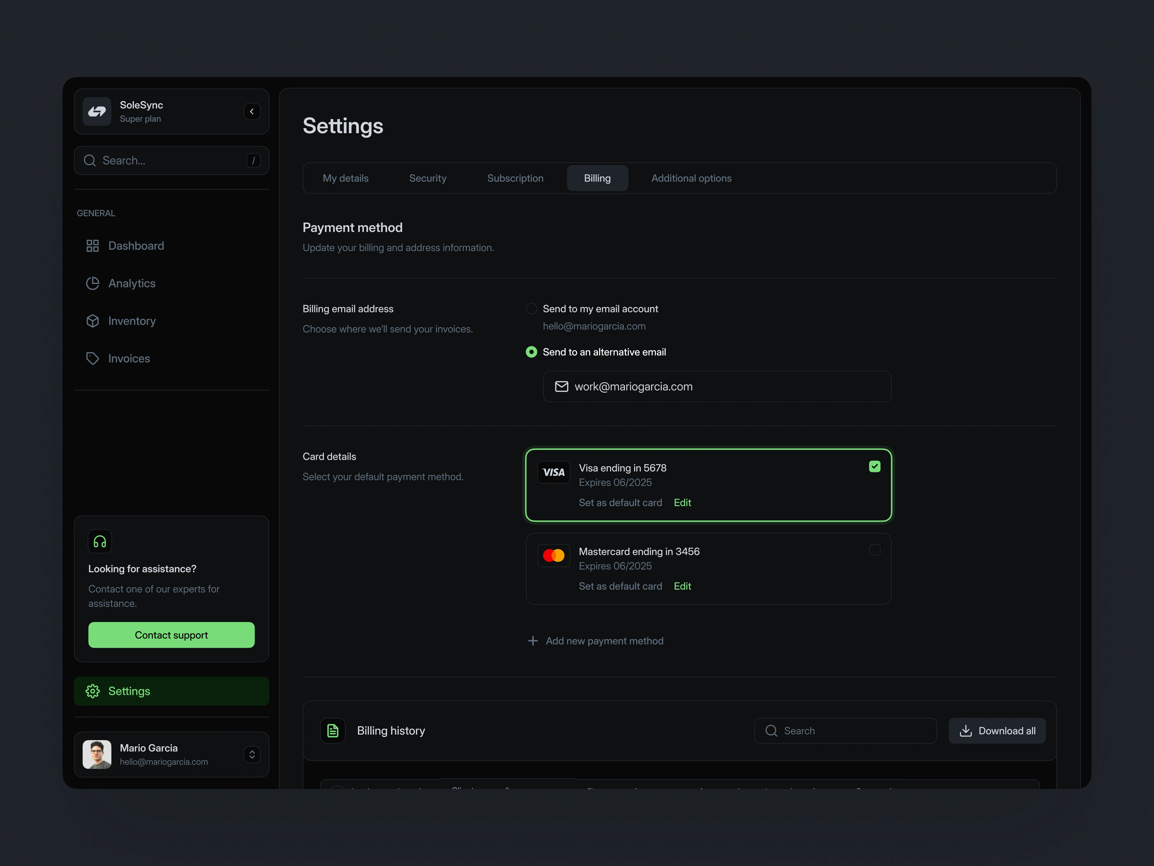 The settings module ensures smooth financial management. Users can securely update payment methods and access billing history, making the platform reliable for both daily use and long-term scaling.