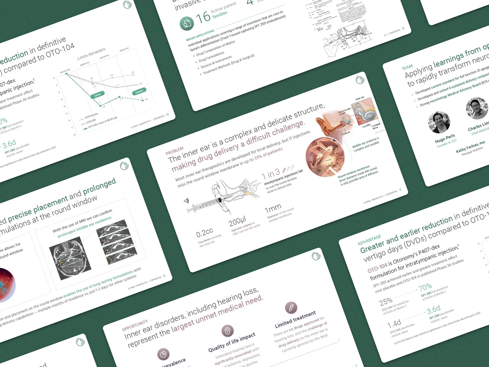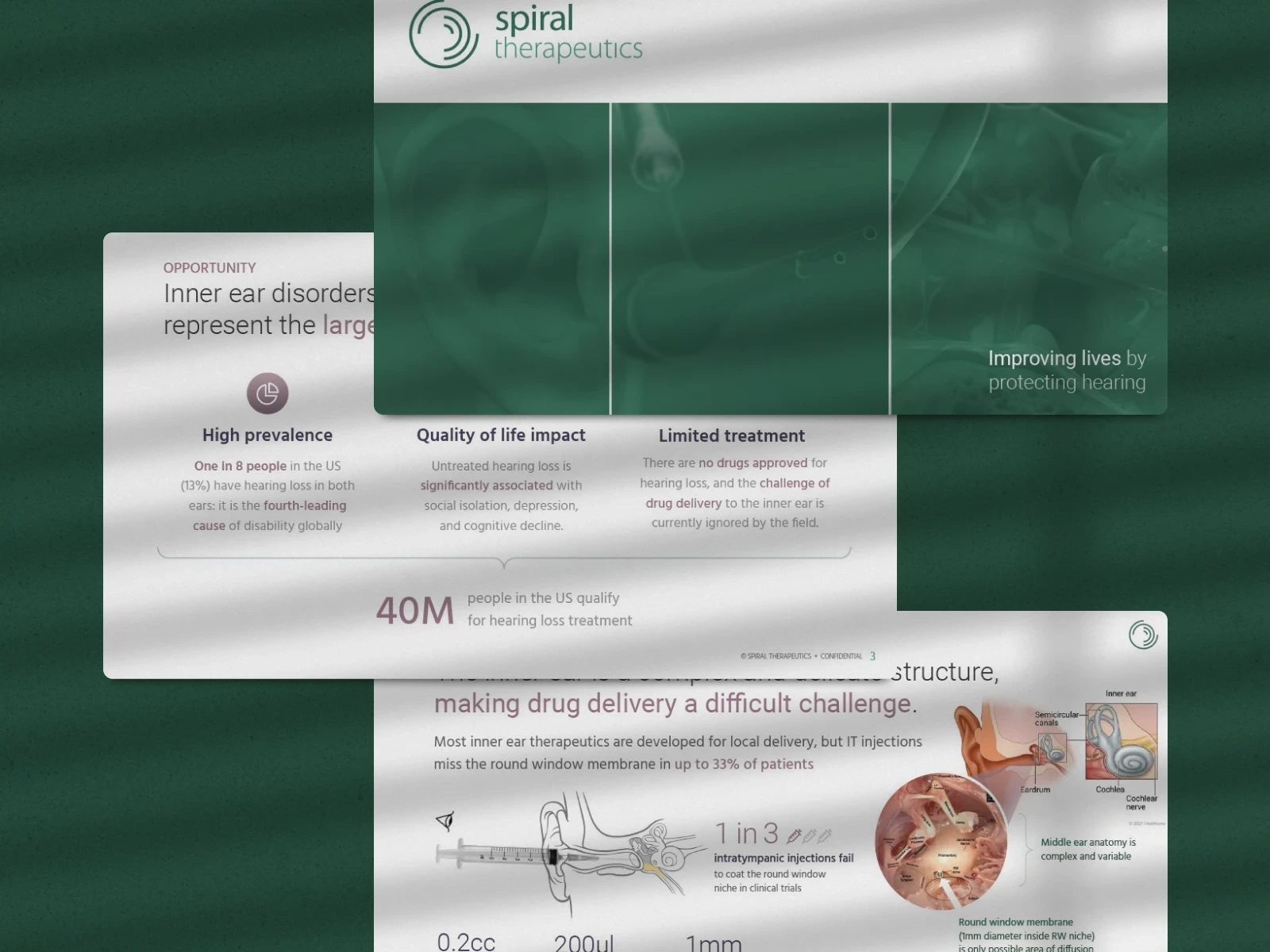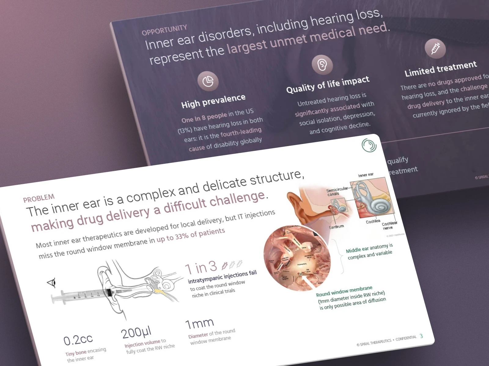 Spiral Therapeutics is a clinical-stage pharmaceutical company delivering novel therapies for hearing loss. Their lead program, SPT-2101, is a sustained-release steroid formulation for the treatment of Ménière’s disease.