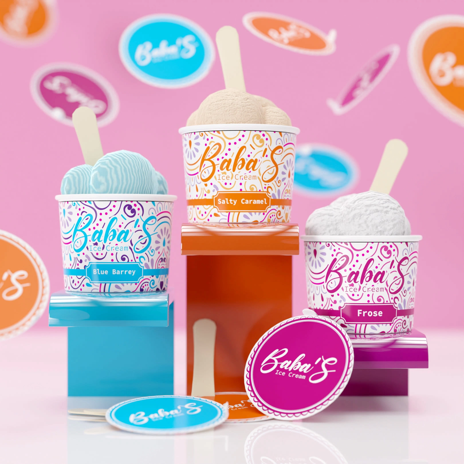 Vibrant, fun packaging design for Baba’s Ice Cream, highlighting rich flavors, freshness, and a playful brand appeal that attracts all ages.