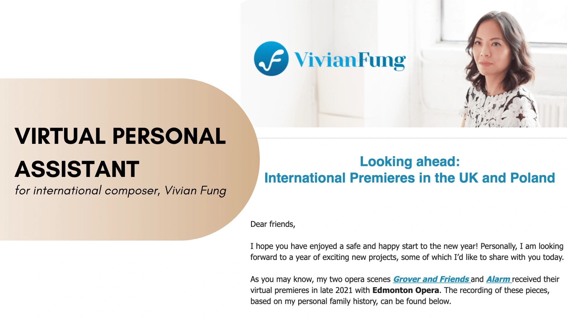 One of my main responsibilities as Ms. Fung's virtual personal assistant was maintaining performance records for royalties. This data entry work required focus, organization, and attention to detail as I was often communicating with world-renowned arts institutions to ensure all information was accurate and thorough.