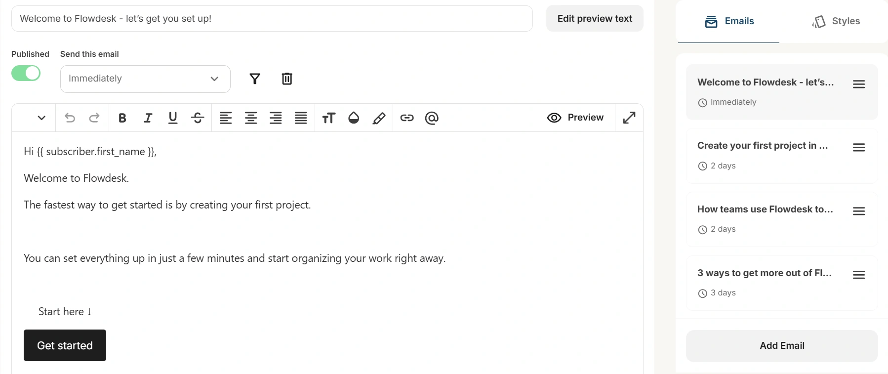 Beyond the initial welcome, I introduced a feature focused email that explains how to structure work inside the platform.