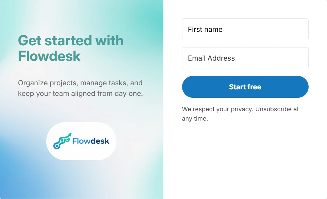 Instead of overwhelming users, the form sets a clear expectation: Start organizing your work in minutes.
