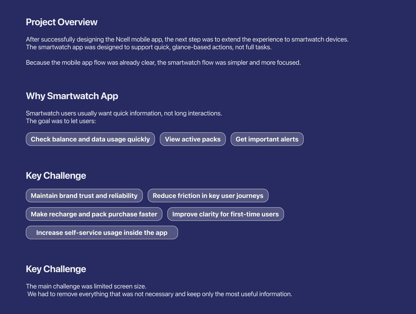 A simple smartwatch UX that brings key Ncell app features to the wrist for fast, everyday use.
