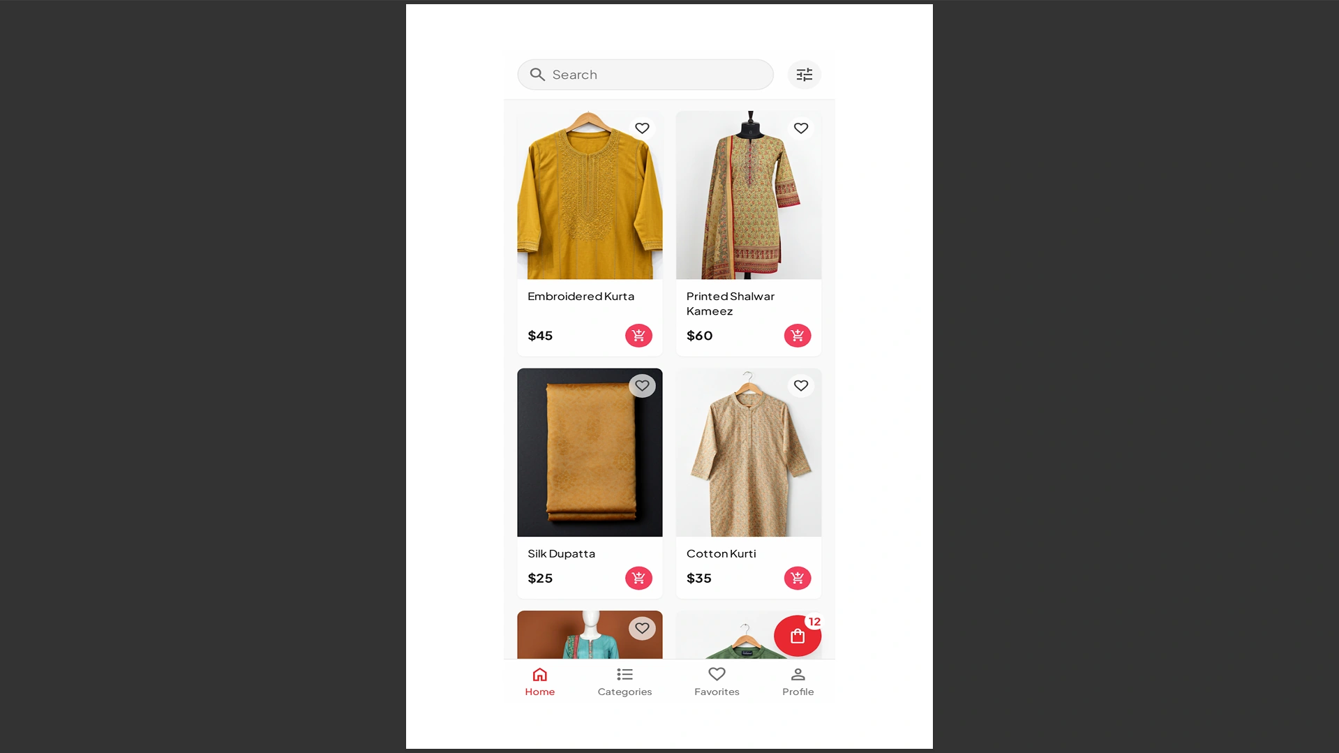 Visualization of mobile app displaying buyer's perspective for purchasing Pakistani cultured female dresses.
