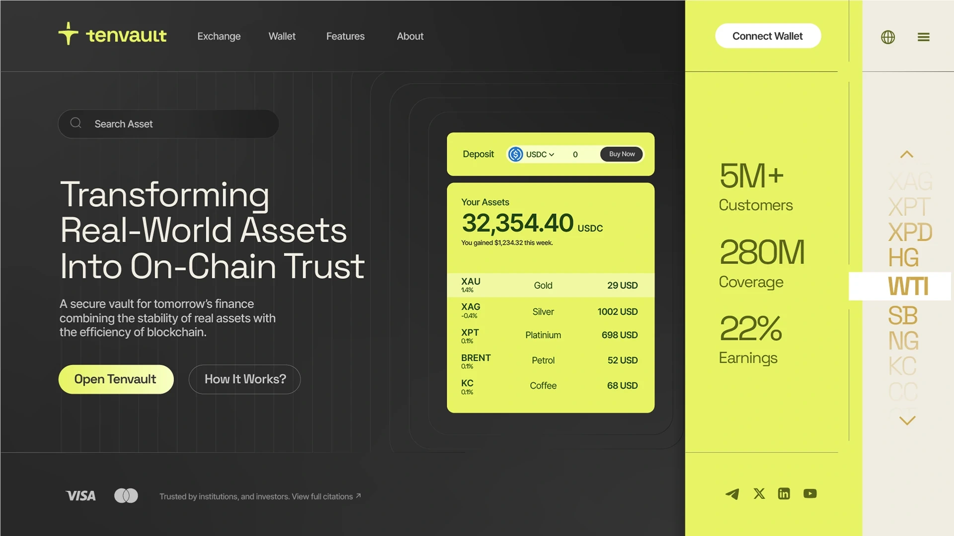 Tenvault is a crypto RWA vault that tokenizes real-world asset exposure such as Gold, Crude oil, fixed income products, coffee beans and etc.