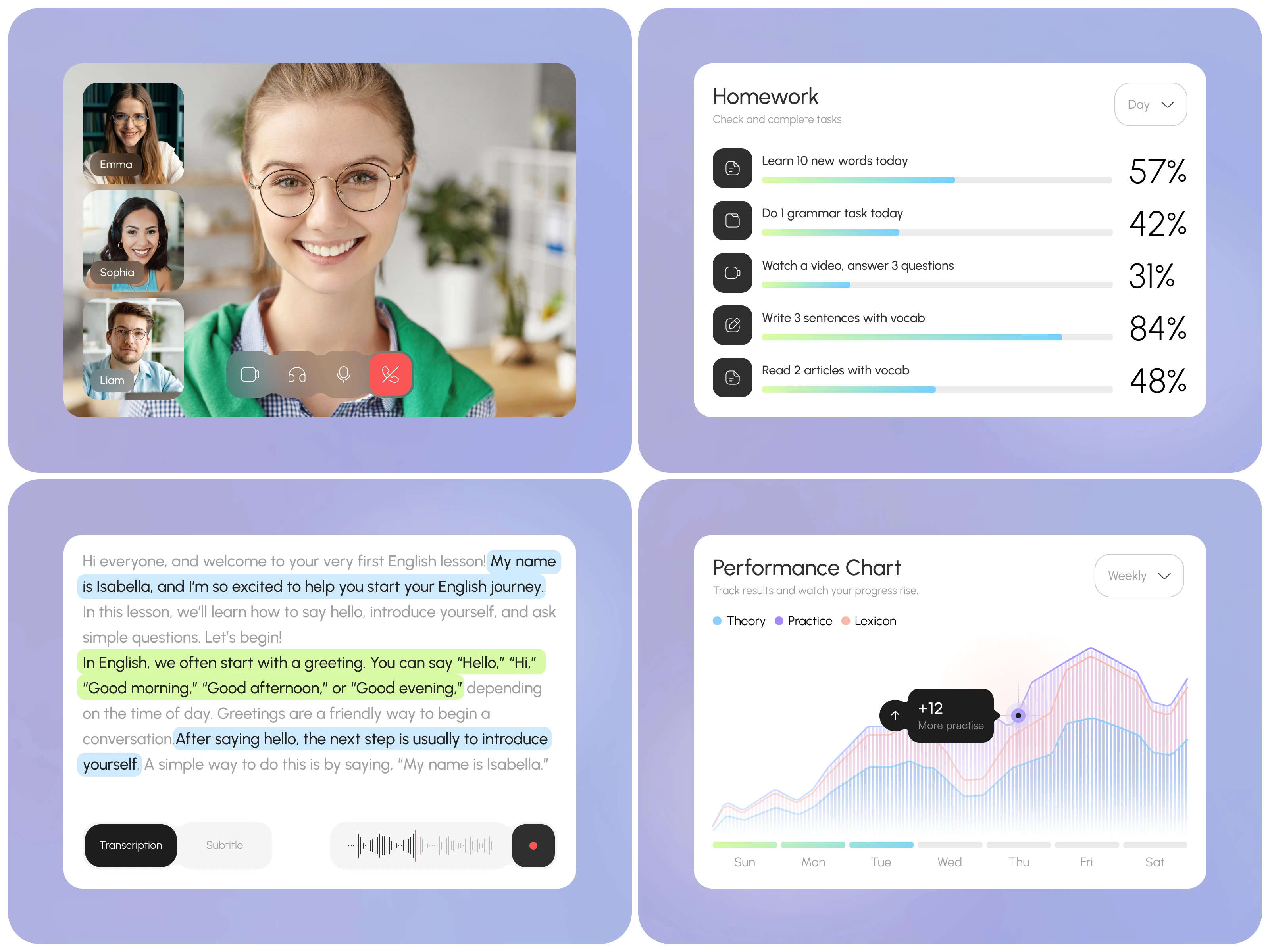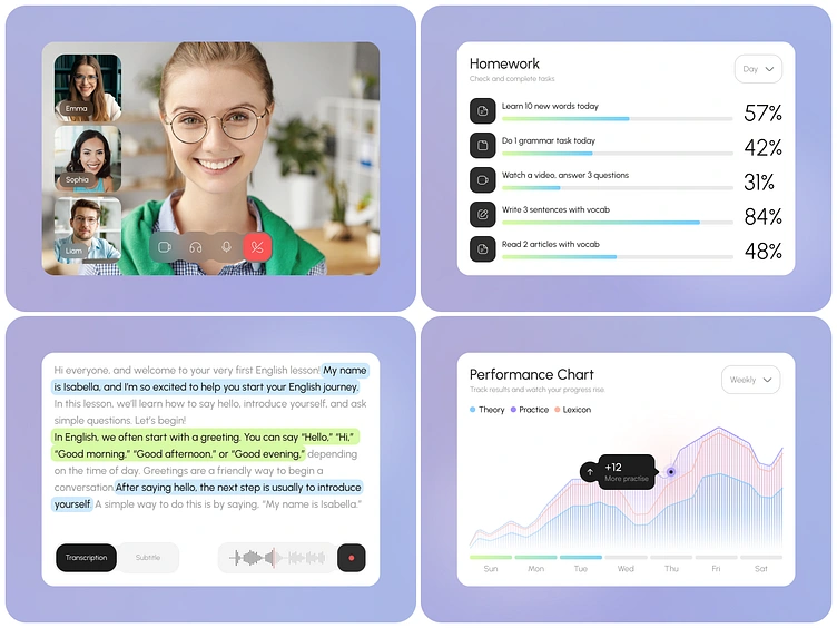 Clean and modern EdTech app design for online learning. The interface includes live video lessons, interactive homework tasks, transcription support, and progress tracking charts.