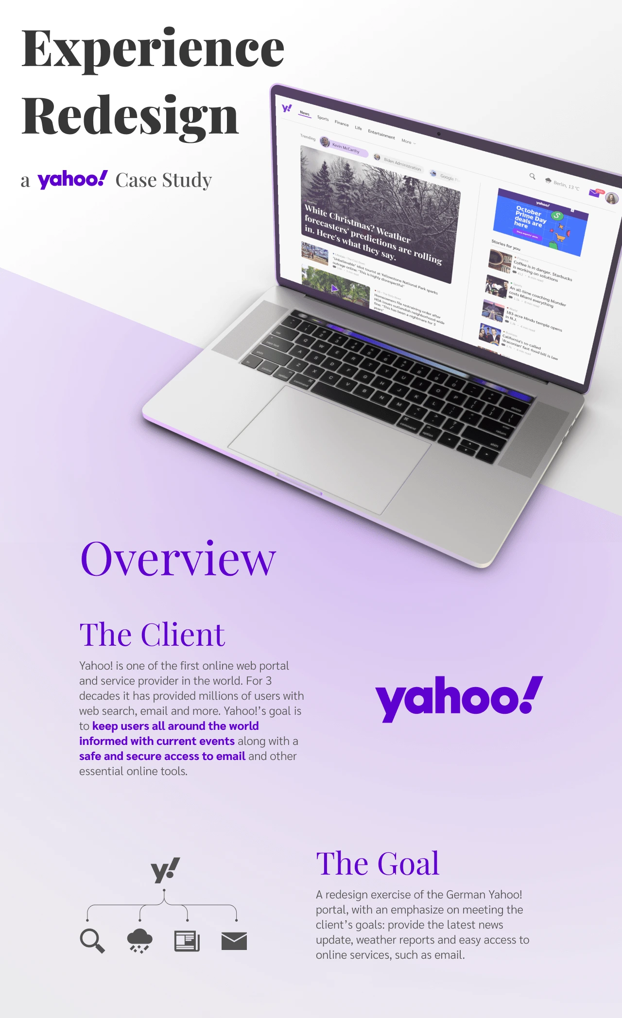 This is a redesign project for my portfolio, created as part of my design training in UXGym. The goal was to create a brand new experience for the German Yahoo! homepage.