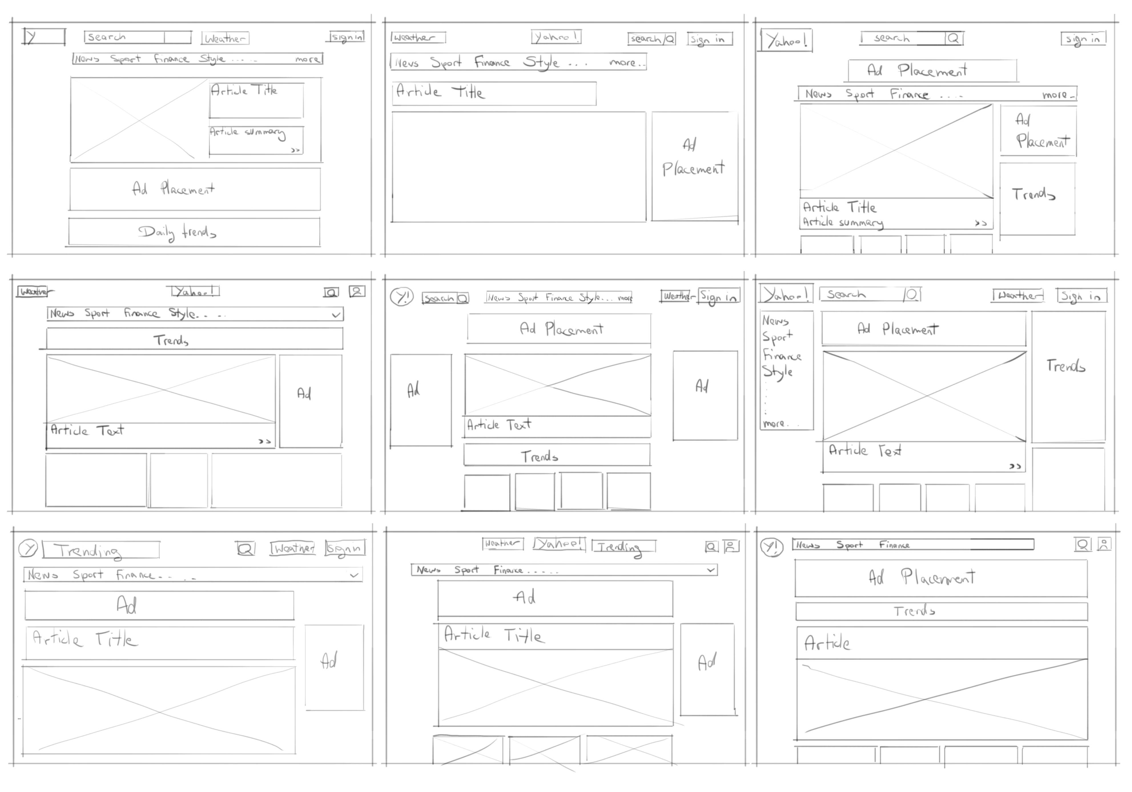Taking my analysis in mind, along with the business goals and the target audience, I start working on new layout concepts. I draw several concepts to get my creative thinking up and running and so that I can have plenty of options to choose from.