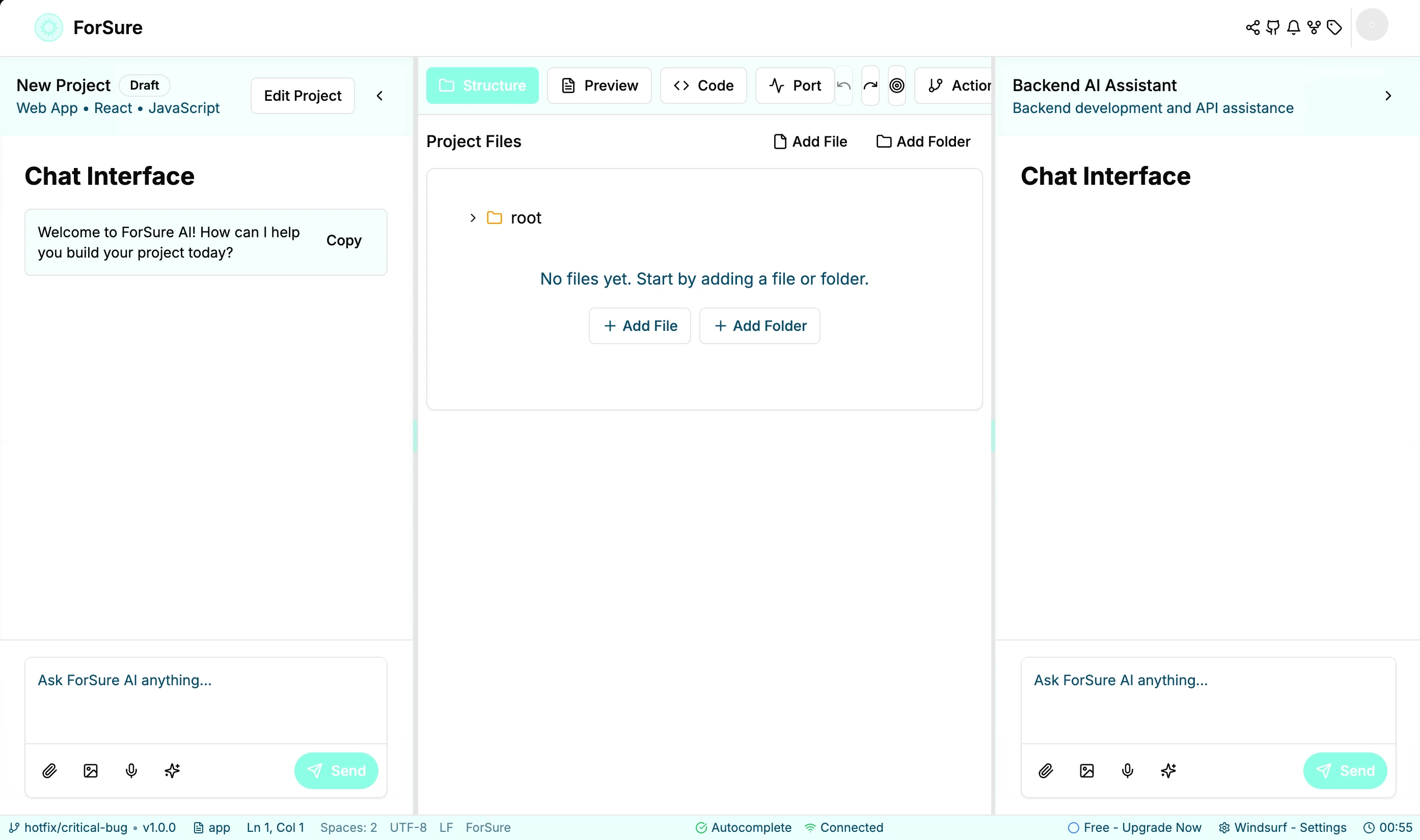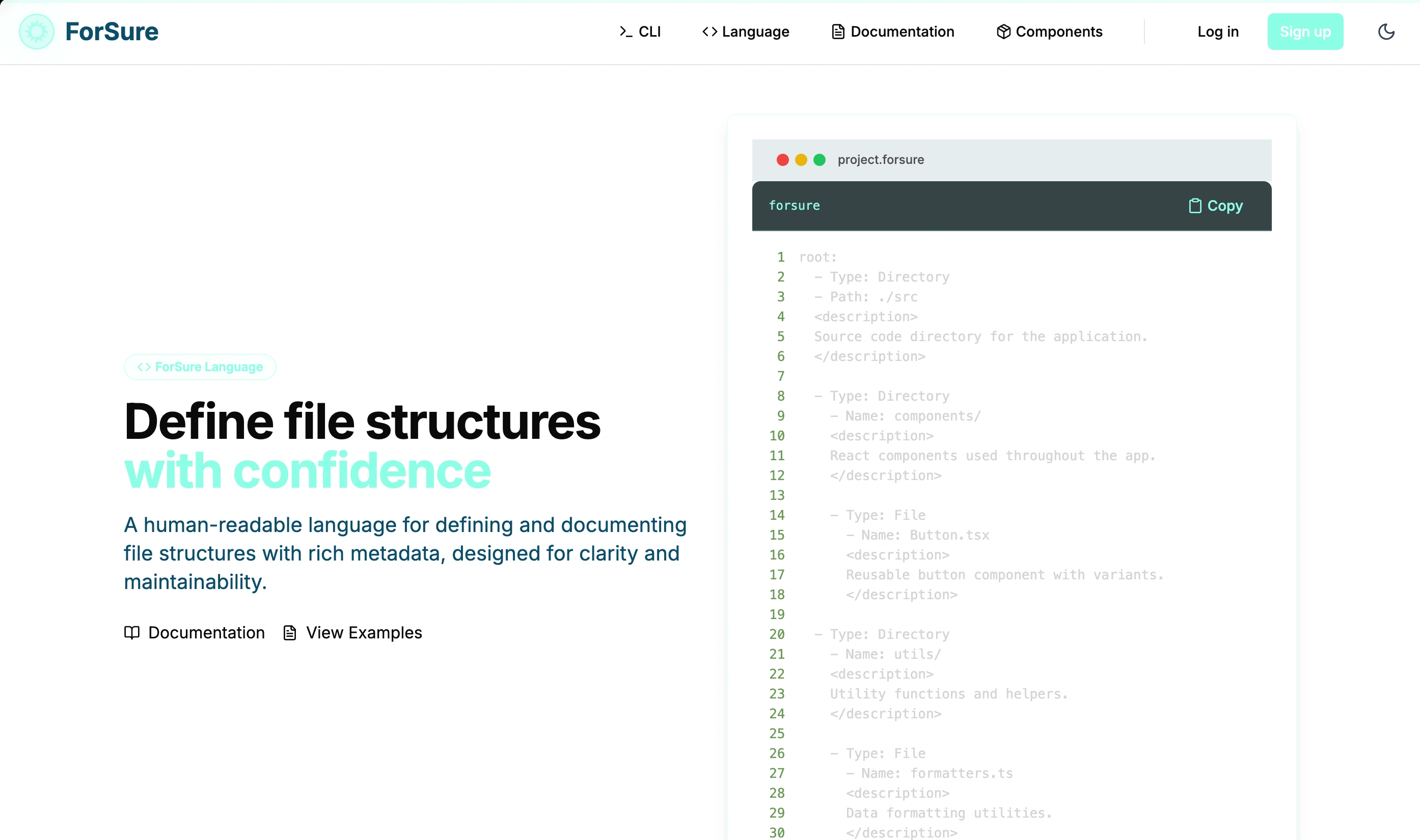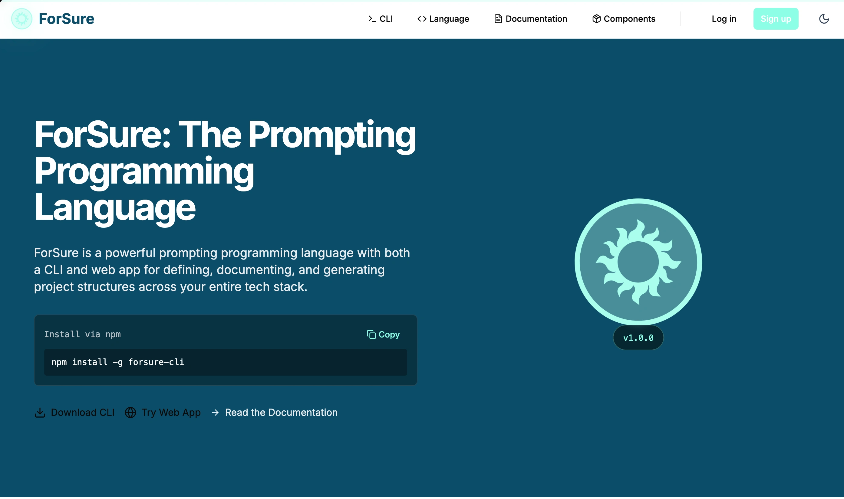 I didn't just build another developer tool—I invented a programming language. ForSure is a domain-specific prompting language that transforms how developers define, document, and generate project structures across entire tech stacks. As a systems architect and language designer, I engineered both the grammar and semantics of a human-readable syntax that bridges the gap between natural language prompts and executable file system operations. This isn't configuration—it's computation. I shipped a complete ecosystem including a globally distributed CLI tool (npm installable), a responsive web application, and an adaptive neural network that learns individual coding styles to deliver personalized project scaffolding. Version 1.0.0 represents not just code that works, but infrastructure that scales.