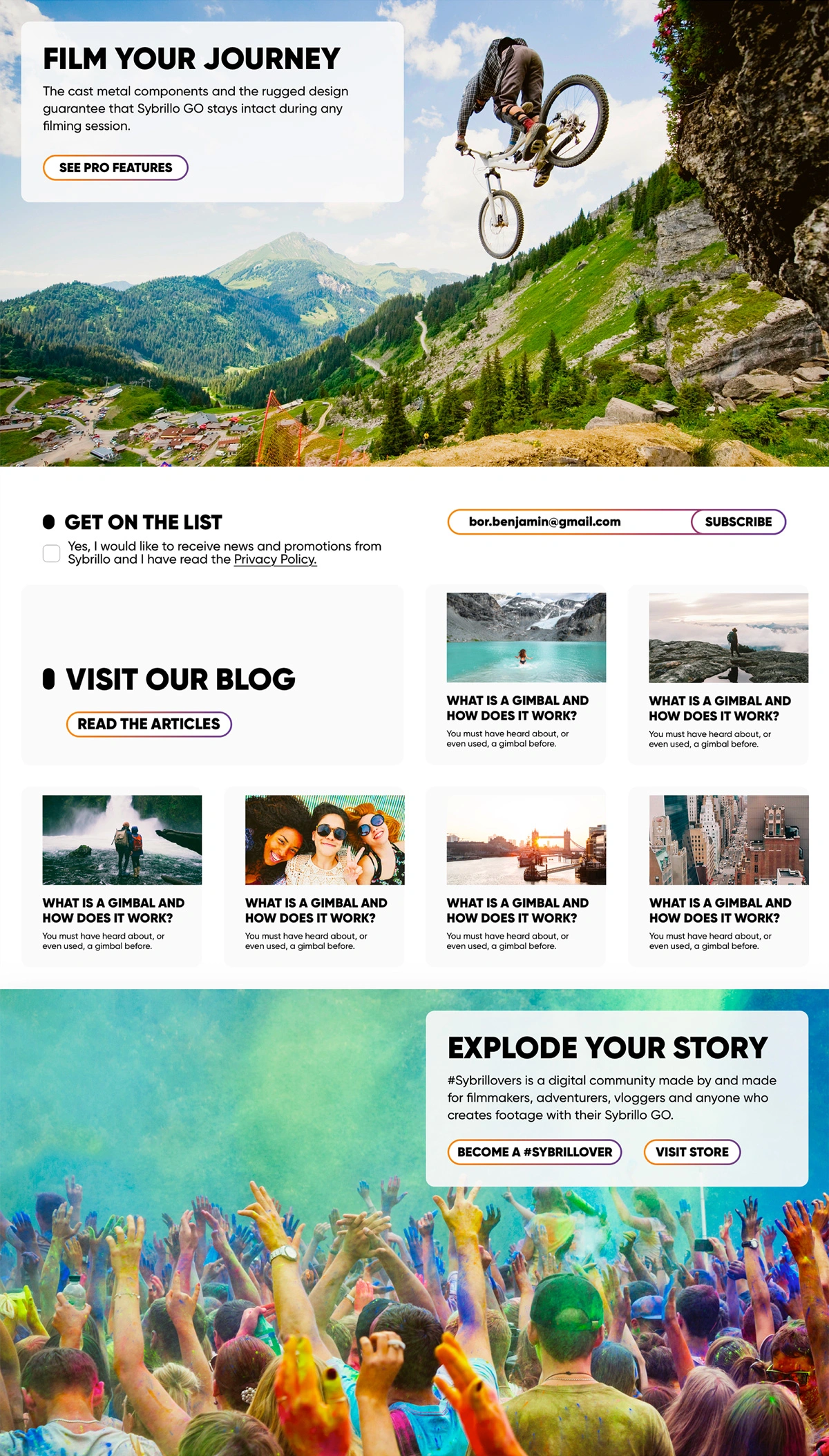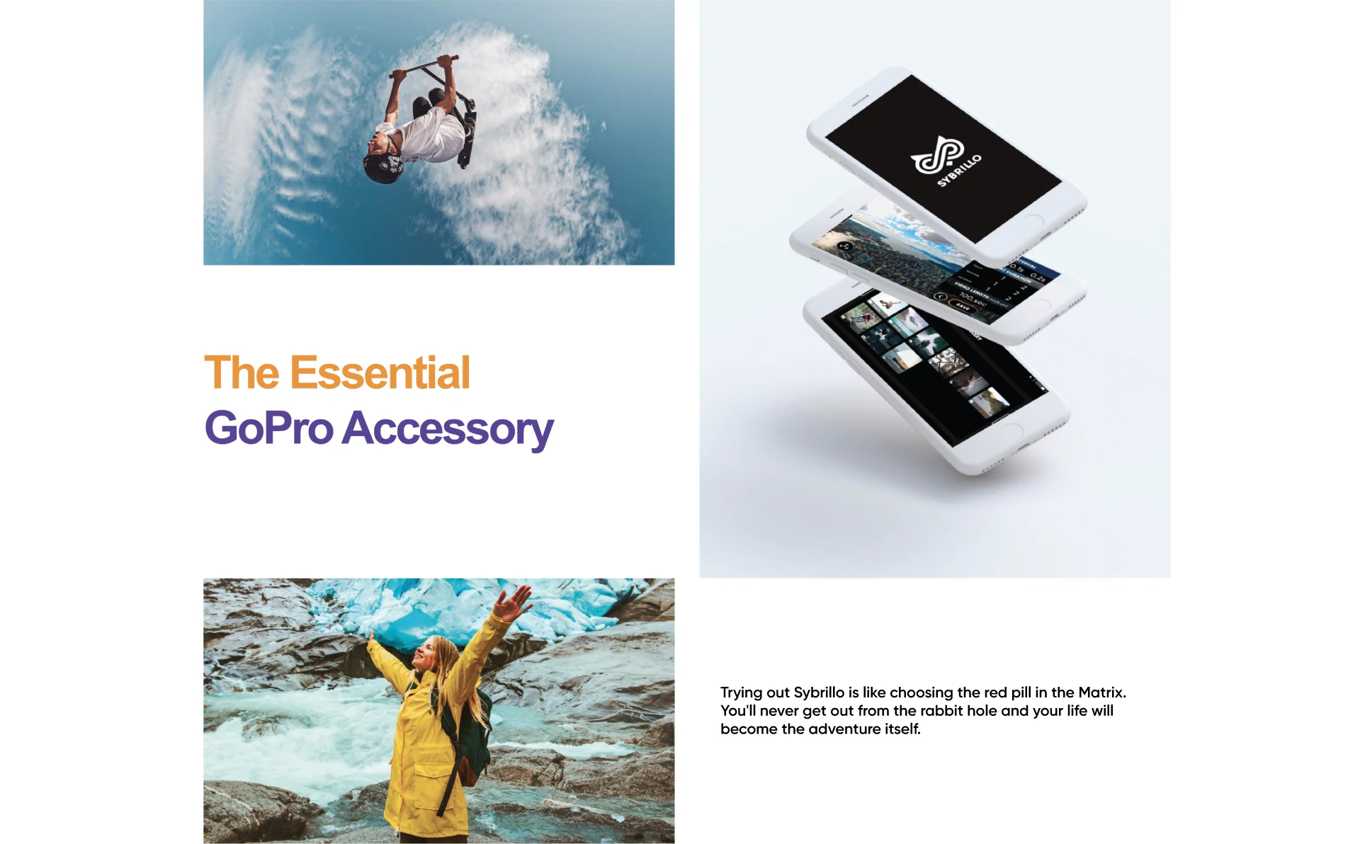 I had the chance to work with a fast-paced startup company, Sybrillo, on spicing up their branding with a fresh and viral appearance. Key visuals, branding, website Design, iconography: utilizing extremity and coolness to target the individual GoPro user and those wanting to capture their undertaking in extreme sports. During, the branding process extremity paralleled with dynamic typography, bold headlines. Freshness was expressed with vivid colors and slick key visuals to symbolise motion; a powerful connection to the product. To summarize, building a real shut-up-and-take-my-money device for the young filmmakers, artists and athletes.