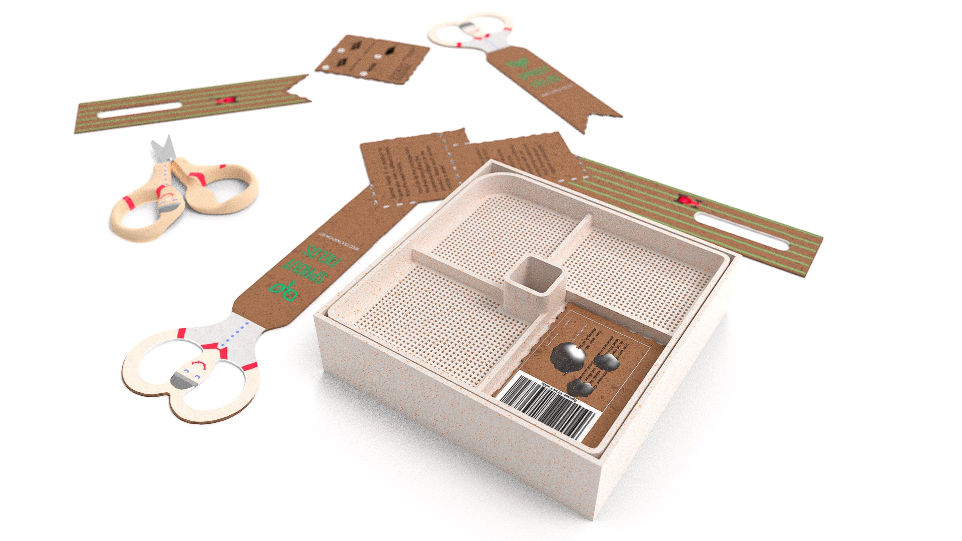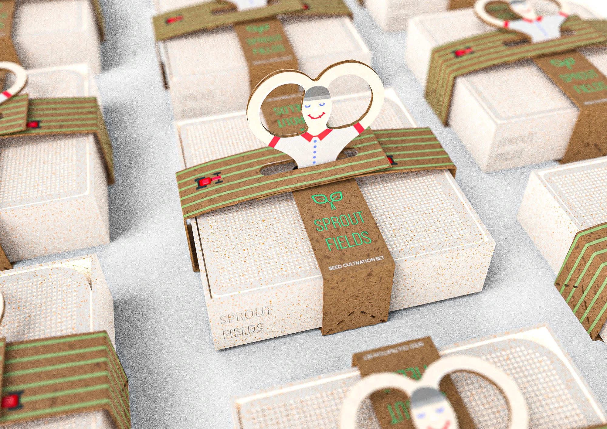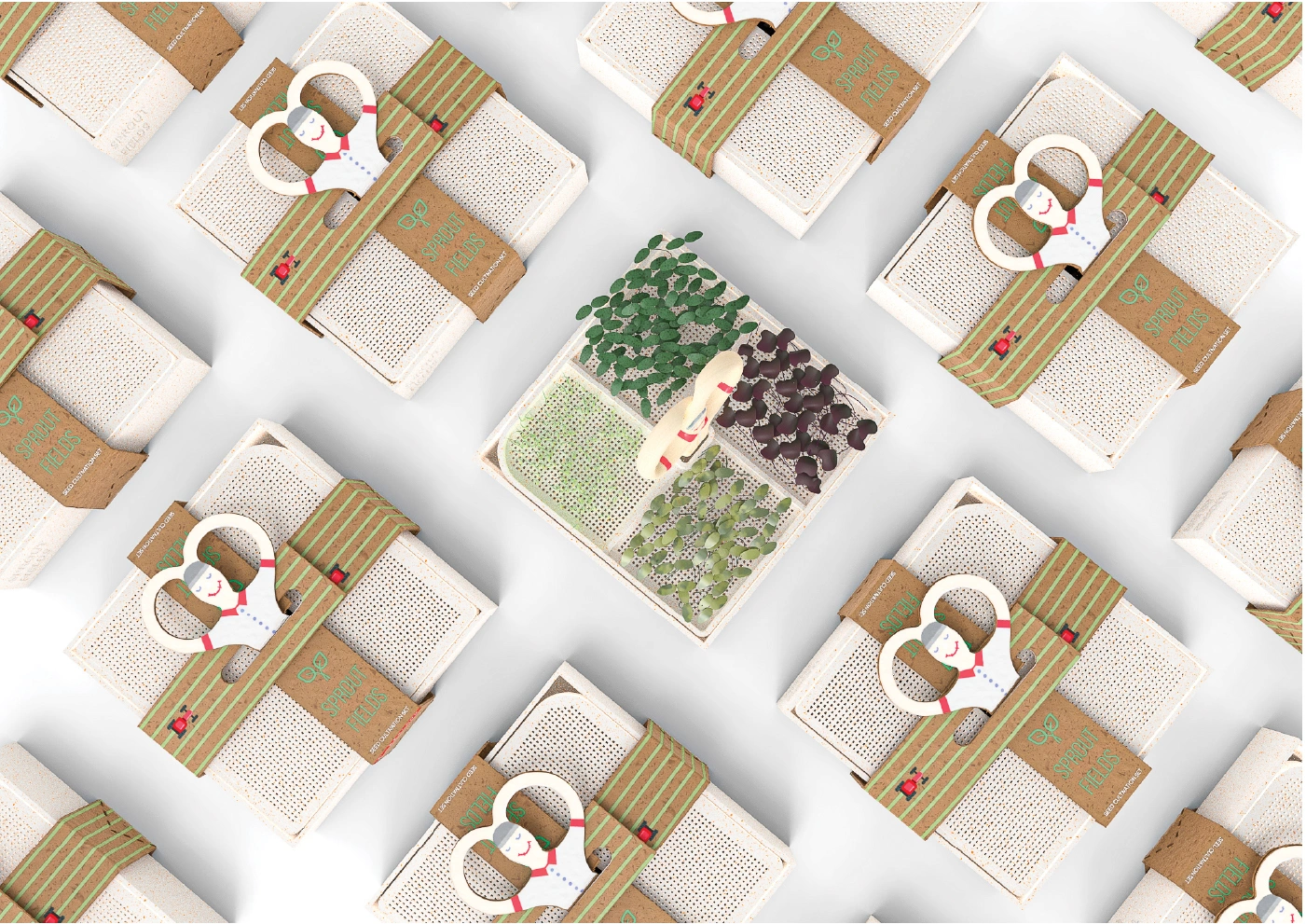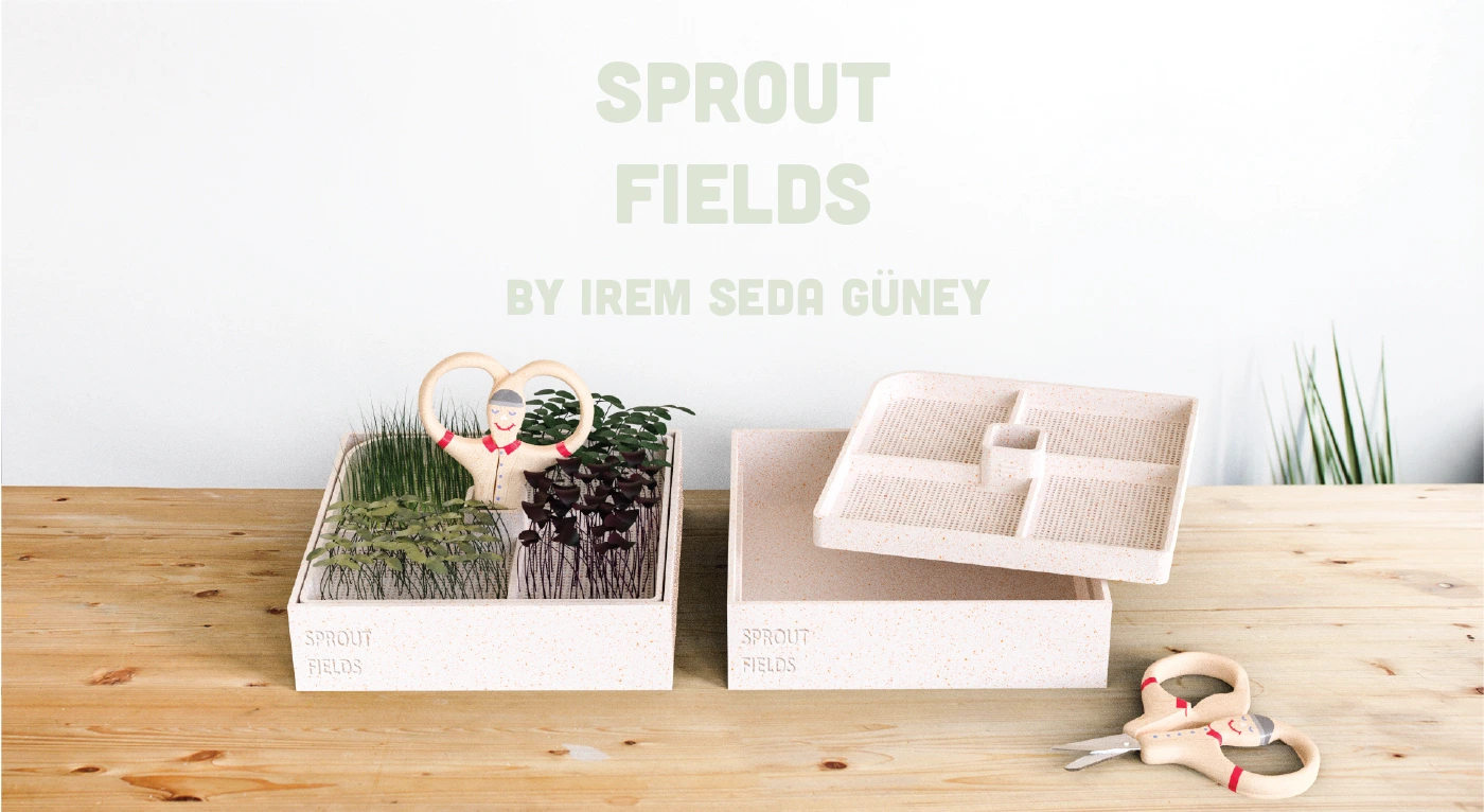 Sprout Fields is a seed cultivating kit that offers an indoor miniature gardening experience with a minimalistic yet heartfelt playful design.