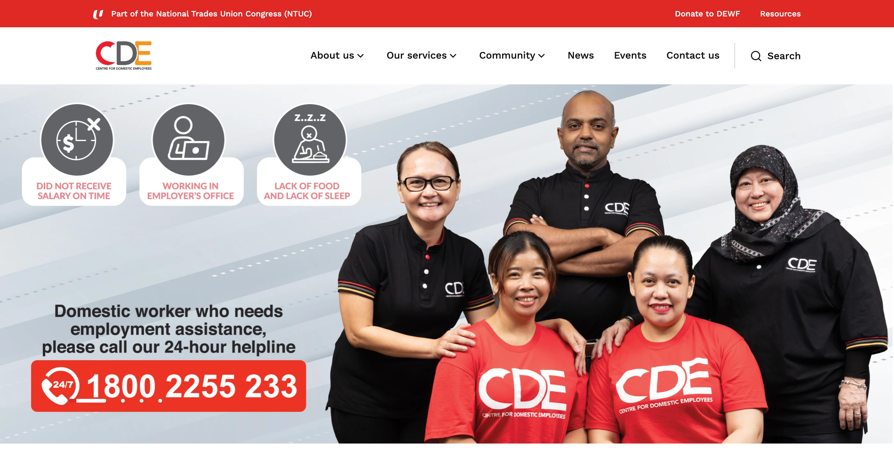Centre for Domestic Employees (CDE) is a Singapore-based non-profit organisation established by the National Trades Union Congress (NTUC) to promote fair employment practices and safeguard the well-being of domestic employees. The organisation supports both migrant and local domestic workers, as well as employers, through advisory services, mediation, counselling, and education programmes.