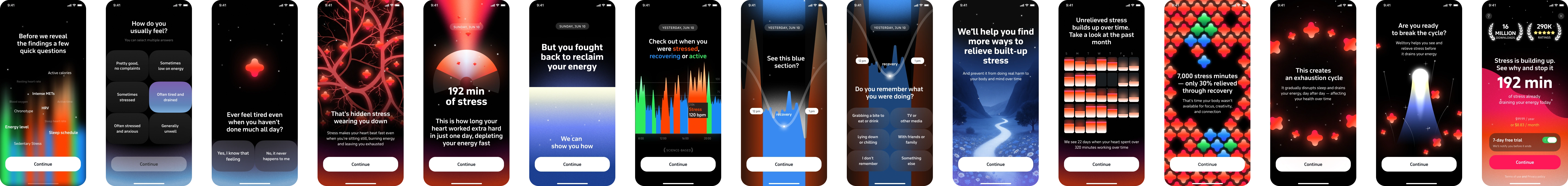 Welltory is a data-driven health app. The goal of this onboarding was to show users — in 26 screens — exactly how their data turns into actionable insights about load, recovery, and how they feel. Instead of standard UI transitions, we crafted a metaphorical visual narrative. This continuous flow kept users hooked through a funnel, driving engagement and creating strong FOMO ahead of the purchase decision.