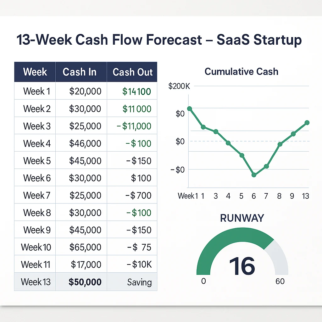 Built a rolling 13-week cash model with daily inflow/outflow detail, cumulative-cash chart, and runway gauge. Helped founders spot a funding gap 7 weeks early.