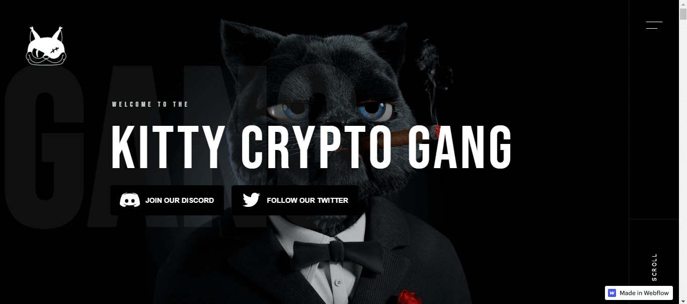 Kitty crypto gang is a website containing multiple pages and sections like About, Services, Portfolio, Contact, Teams and Announcments.