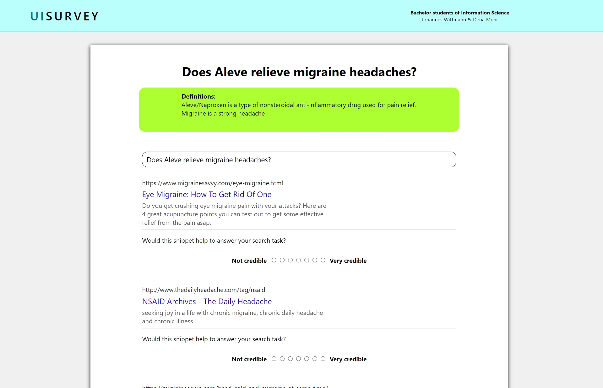This survey is used to determine changes in credibility rankings, based on search engine result pages. More in detail, it should hand results, captured with likert scales, which show the difference between only looking at Snippets (The URL, Title, description ...) and looking at the content of pages itself.